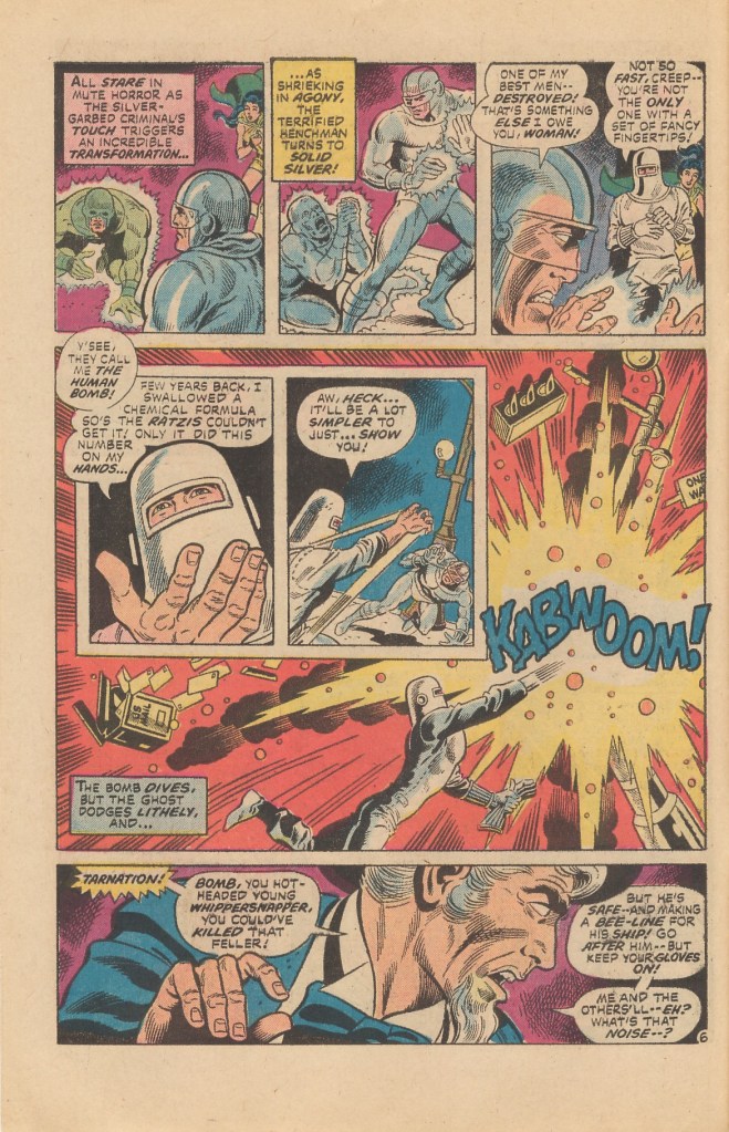 For reasons that don’t make a whit of sense given the fact that their own world had been overrun by the Nazis for decades and there must have been an amazing amount of work to be done restoring democratic civilization, the issue opens with the Freedom Fighters having decided to relocate to Earth-1, DC’s prime Earth. This makes sense from a publishing standpoint, in that you’d want the characters to be able to easily interact with the other DC heroes as guest-stars, but from an in-story perspective, it’s nonsense and doesn’t make the Freedom Fighters look all that good. Fortunately for the need to establish who everybody is and what they do, no sooner have they arrived than there is a detonation at a nearby building, and the Freedom Fighters find themselves battling the villainous Silver Ghost and his minions.