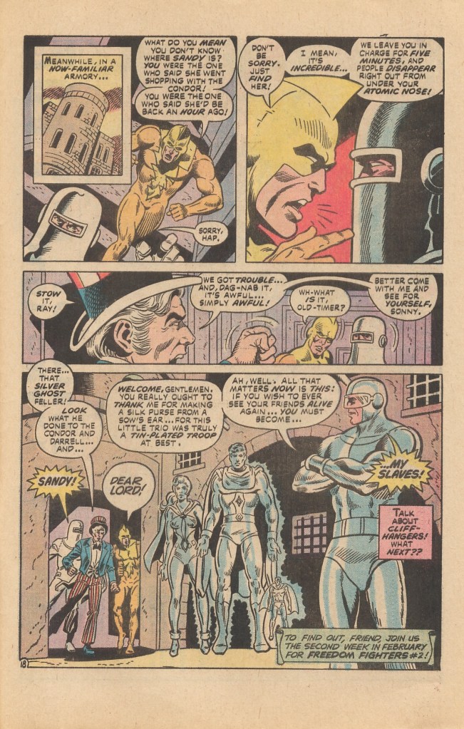 Three Freedom Fighters are in the city at the time, and so we get a second fight scene, as they battle the two super-villains. But the Silver Ghost’s power is the ability to turn anybody he touches into a silver statue, and he eventually is able to use his ability on the Black Condor, Phantom Lady and Doll Man. Giving up his telecommunications plan, the Silver Ghost instead carts the three silver Freedom Fighters back to the team’s new HQ (how he knows where it is given that they only got it yesterday is another mystery for the ages–the comics of the 1970s weren’t always tightly plotted) and presents an ultimatum to the remainder of the team: if they ever want their fellow members restored, they need to do his bidding. And that’s where this issue is To Be Continued. It’s a perfectly fine comic book, but nothing special–and in fact, it feels a bit by-the-numbers in the same way that CHAMPIONS did over at Marvel, like Conway was assembling his new book by following an established blueprint for what made for a successful comic. As I mentioned at the top, though, it didn’t really do much for me–none of the Freedom Fighters had much to recommend them in terms of personality or distinctiveness.