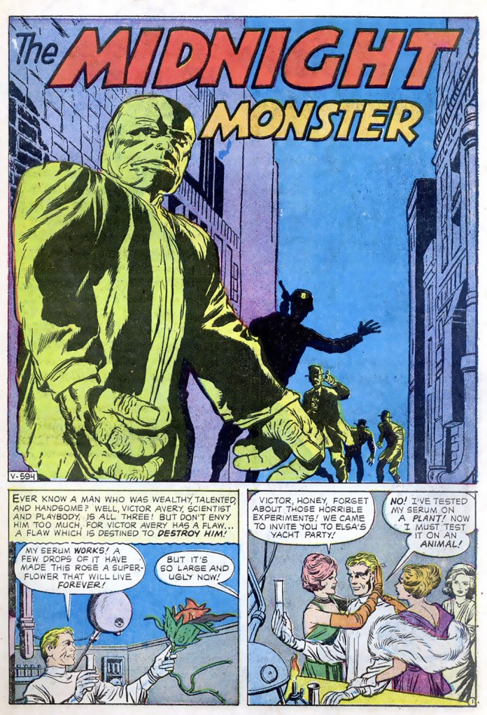 This story was only completed shortly before work on INCREDIBLE HULK #1 would have begun, and its subject matter would have been clear in Kirby’s mind, for all that it is a very different treatment of the same underlying idea. In interviews, Kirby occasionally made mention of the fact that the Hulk was spun off from a similar treatment in a one-off story, and “The Midnight Monster” appears to be that story. There are no credits on it, but I am guessing that it was scripted by Larry Lieber, as many of these pre-hero Marvel monster stories were.