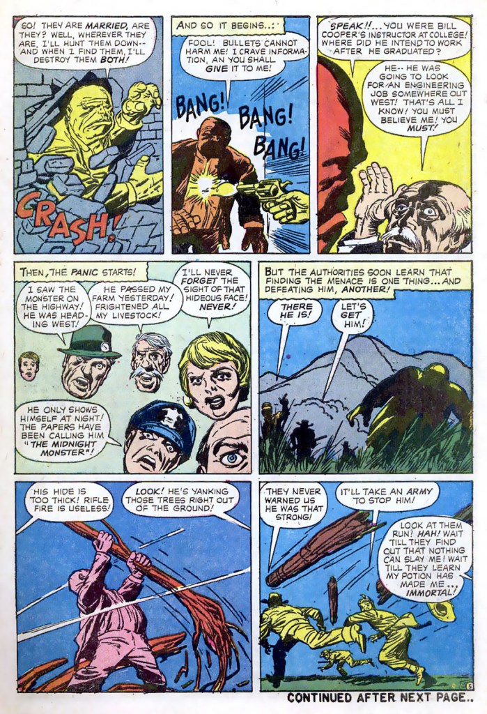 Still, this transformation over thre panels mirrors those that Kirby would typically depict for the Hulk (as well as whenever Ben Grimm would become human again in FANTASTIC FOUR). And the overall look of the Midnight Monster here pulls from the same Jekyll/Hyde and Frankenstein source inspirations that the Hulk would also follow.