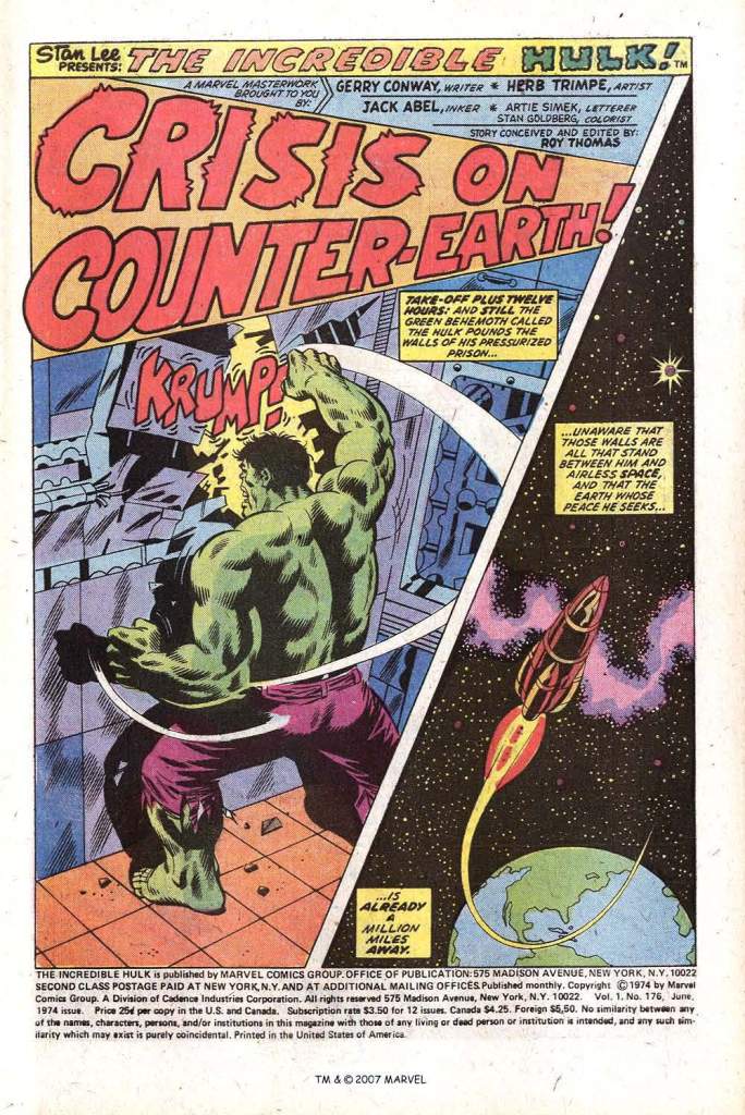 The story in this issue was the first part of a three-part adventure designed to wrap up outstanding plot threads from the cancelled WARLOCK series. Marvel was pretty thorough about using its existing titles to clean up lingering business from the books it had ended. I don’t know how many HULK readers might have been following WARLOCK, or cared, but it made for a fine background for an adventure in any case. The issue opens with the Hulk having been shot into space by the Inhumans in order to get rid of him. The brute doesn’t understand what is happening, and so he pounds on the side of his ship, struggling to liberate himself, unaware that he’s fouling up the guidance system. He winds up crashing down on Counter-Earth, the parallel world created by the High Evolutionary situated on the other side of the sun, the world in which Warlock was the one and only super hero, a kind of quasi-Christ figure.