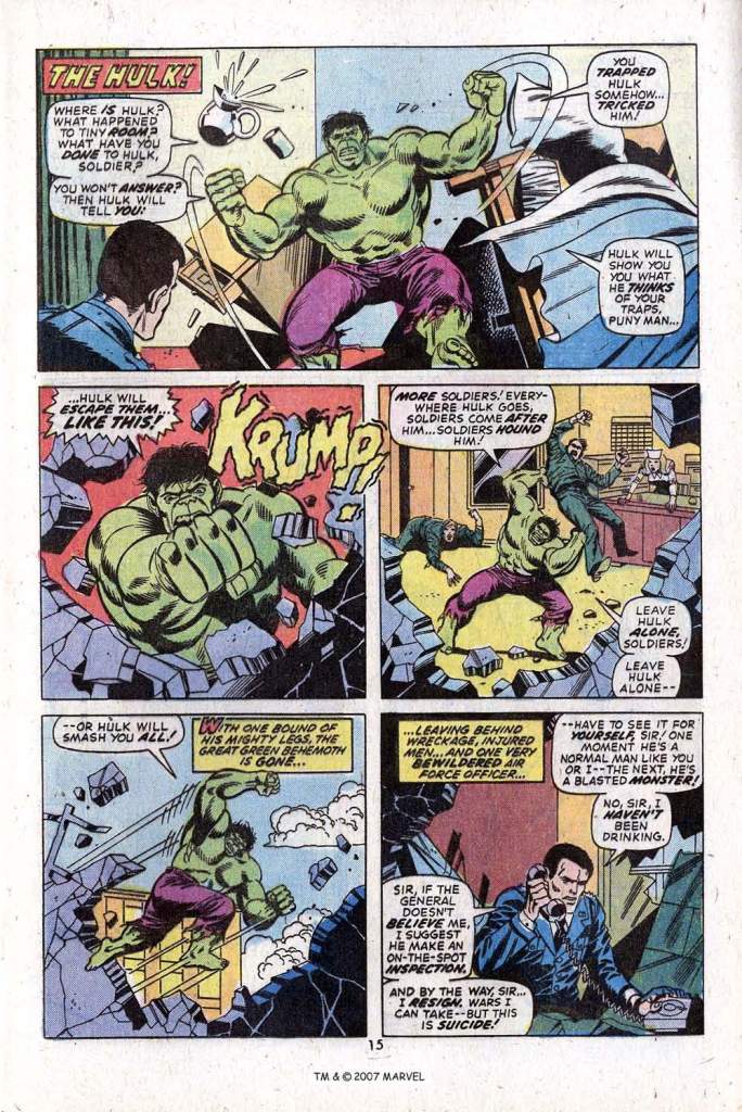 The issue takes a few pages out at this point to check in with Betty Ross and her father General “Thunderbolt” Ross–Betty is depressed because her husband Glenn Talbot is believed dead, as is Bruce Banner, the man she really loves. But the scene cuts elsewhere, to behind the Iron Curtain, where a captive Glenn Talbot is in the process of escaping captivity. Or so it appears–the comments made by the head of his pursuers makes it clear that Talbot has been released for some nefarious purpose which will become apparent in future issues. Back on Counter-Earth, the Hulk’s capsule is recovered at splashdown and Bruce banner is retrieved by the authorities. but he’s got a counterpart on Counter-Earth already, one whom his rescuers realize is elsewhere. This makes them assume that their new arrival is a spy for the radical Adam Warlock, who has been causing chaos and upsetting the status quo. Their pointed questioning makes Banner anxious, and that’s always an unfortunate thing to do, because as his pulse rate increases, he transforms into the Hulk and begins trashing everything in sight.