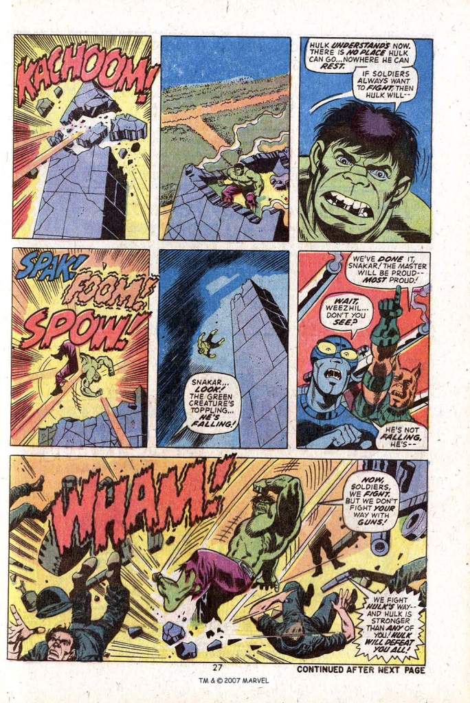HULK was an extremely popular book in the late 1960s and early 1970s–there was something about the hyper-mighty monster being persecuted by people wherever he went that really spoke to the more casual audience for comic books in that decade. Or perhaps it was the fact that any given issue of HULK was more likely than most to be chock-a-block full of ridiculous action. It was a title that I wasn’t all that enthralled about at the time. The premise felt a bit limited to me, with the Hulk not really having much of a supporting cast or even a goal, wandering hither and yon and fighting a variety of other monsters, super-villains and the ever-present Military -Industrial Complex. I suppose it’s just the way my fantasies leaned–I never wanted to be a super-strong simpleton, and while I had my own issues with anger, I didn’t relate them to the Hulk’s struggle. But it was a super hero comic, at least ostensibly, and so I tended to read it when available.