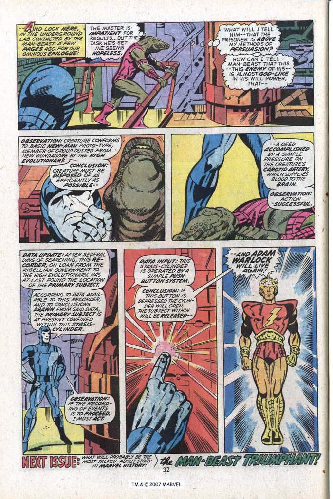 While this is going on, the Man-Beast gets a report from a hidden laboratory that all of the New Men’s attempts to break the will of the captive Adam Warlock have come to nothing. As the issue wraps up, a Rigellian Recorder appears from out of nowhere, incapacitating the inquisitioner attempting to subvert Warlock’s mind. The Recorder indicates that he was sent her to locate the missing Warlock by his father-figure, the High Evolutionary, and he freed Warlock from confinement. To Be Continued! This story was apparently plotted by Roy Thomas, who had come up with the Warlock concept as a Marvel answer to Jesus Christ, Superstar, making the protagonist a direct Christ analog–one that he’d take even further in the issues ahead. Roy didn’t end up scripting this issue, that task fell to the omnipresent Gerry Conway, who was everywhere in these days, and who did a solid if undistinguished job of it. This was all before Jim Starlin came along and found something new and interesting to do with Warlock (and then spent decades doing it over and over again) so the character was still a bit formative, for all that he’d appeared in close to a dozen stories already.