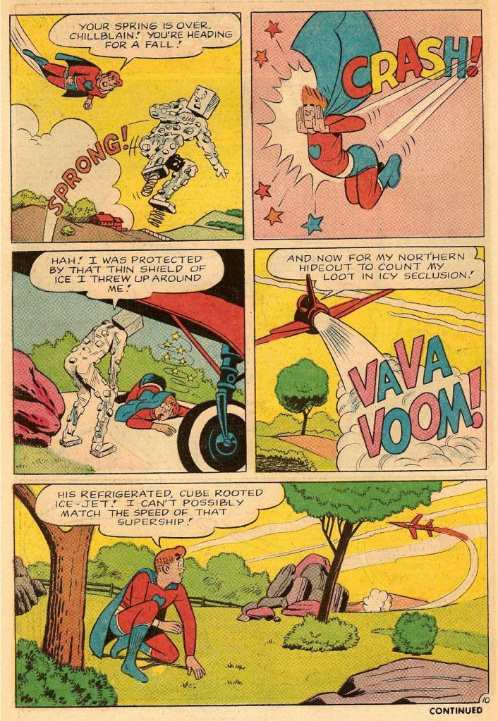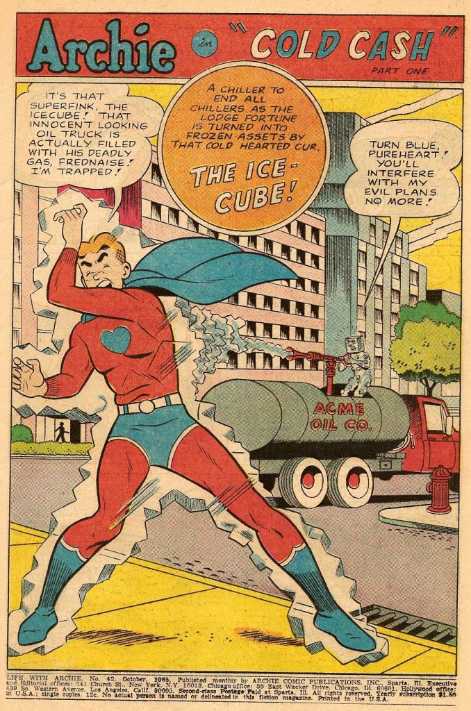 In this first adventure, Pureheart is simply a standard Superman-esque hero. Later stories would make him more specific: he would fly thanks to rockets installed on his belt, and his powers would stem from his PH factor–his purity of motive. Archie would become Pureheart whenever danger would threaten his one true love, Veronica.