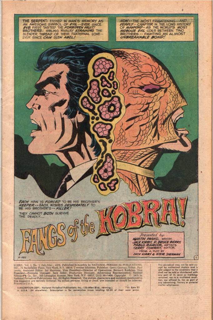 Kirby only produced one issue of KING KOBRA, and somebody, presumably DC’s head man Carmine Infantino, who had come up with the core concept of KOBRA along with Kirby, didn’t like it. He didn’t even bother to burn it off in 1ST ISSUE SPECIAL as was done to a few other stranded Kirby projects. The book sat around in the DC offices until newly hired editor Gerry Conway was casting about for more projects for his office. He took on the responsibility for overhauling KOBRA, bringing in writer Marty Pasko to completely rewrite the first issue, and artist Pablo Marcos to make extensive revisions to the art. The big one was making the lead hero, Jason Burr, much younger. So you’d get pages like this splash above, that were half-Kirby and half Marcos with the pieces not really integrating terribly well.