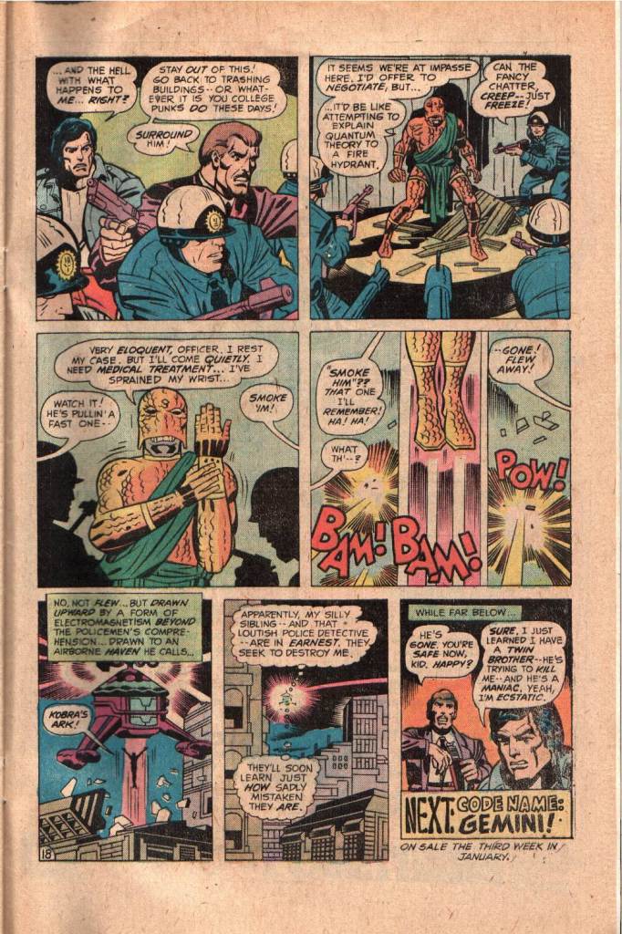 Kobra’s got a new plan, though: he intends to abduct Burr and imprison him for the rest of his life, so that Kobra can be sure that his vulnerability will not be exploited. But before he can act, he’s compelled to seek Burr out himself, as the young man deliberately burns his hand as on the cover to draw Kobra to him. This is a trap for teh villain, but one that Kobra is well up to facing. And Burr himself is horrified that Perez’s men seem intent on killing Kobra, not simply capturing him–and if they succeed, he will die as well. But there’s little chance of that, as with his snake-like attributes and gimmicked-up weapons, Kobra is a match for Perez’s squad of Keystone Kops, and he easily gets away. But now Burr is tangled up in this mess whether he likes it or not. And that’s where this first story ends. The final panel pretty clearly replaces an area where Kirby had a blurb for the next story, a story that would now be totally different in Pasko’s hands.