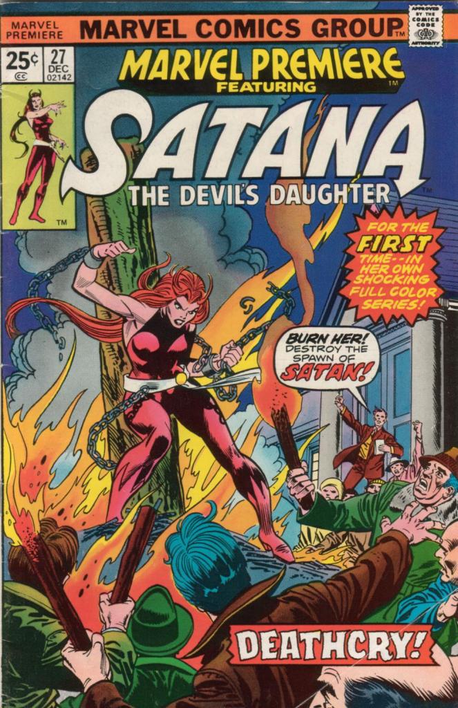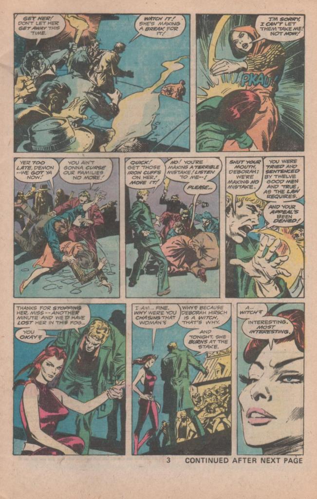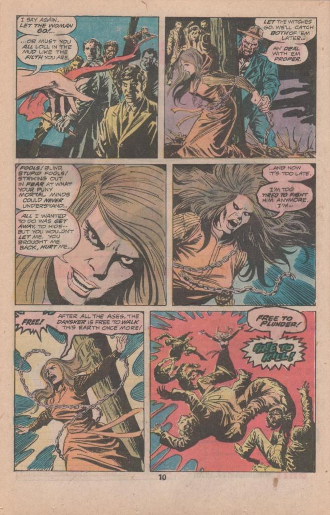 All that said, this is a pretty dumb story. It opens with Satana, the devil’s daughter, on a random street, where she’s knocked into by a fleeing woman. The girl is being pursued by an angry mob, the leader of which tells Satana that the lady has been found guilty of being a witch, and must be put to death by burning. Right away, this is an awesomely stupid thing to be telling some random person you just ran into. And indeed, after preparations have been made, the witch-burning is interrupted by Satana–for really no good reason at all, she’s decided to intervene. In a very Claremontian moment, when one of the mob men tries to waylay her, Satana makes him crawl in the mud like an animal. But whoops, it turns out that the woman really is possessed, by a demon called Dansker, a demon who had once been Satana’s tutor in Hell. Heck of a coincidence there.