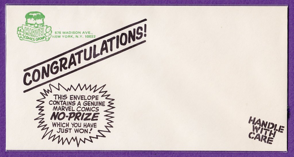 The No-Prize originated as a joke, back in the early 60s, in Stan Lee’s letters pages. He ran a poll or an essay contest, and indicated that there’d be “No Prize”, since there’d be no winners. But the term stuck in his lexicon, and eventually, at about the same time that the Merry Marvel Marching Society was formed, Stan had a bunch of envelopes printed up like the one in the image beside this page, indicating that the recipient’s No-Prize was enclosed. The envelopes, of course, were empty.