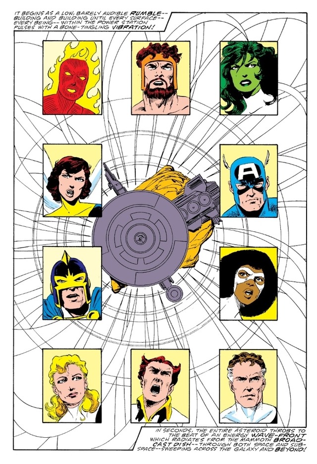 These are pages from a pair of Annuals released in the mid-1980s, an AVENGERS Annual and a FANTASTIC FOUR Annual (both of which are being reprinted in the new volume of the FANTASTIC FOUR VISIONARIES: JOHN BYRNE series, in stores today). While each of these Annuals told a complete story by itself, the events of the two stories overlapped at the end, with the Avengers and the FF coming together to solve their larger mutual problem in the concluding pages.