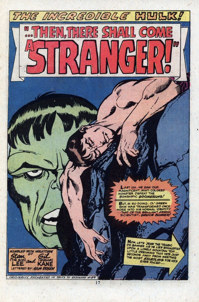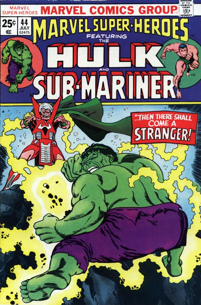 As with every issue of MARVEL SUPER-HEROES, this one reprinted an entire TALES TO ASTONISH issue from a number of years before, so you got both a Hulk story and a Sub-Mariner tale. The Subby story opened the book, and it was a rare collaboration between editor Stan Lee and Namor’s creator Bill Everett. And to be perfectly honest, I found it dull. The artwork was very nice, but somehow a bit stiff and old fashioned seeming. And I never truly got into any of Stan’s king heroes when they were headliners–the Black Panther, Black Bolt, Namor–they all seemed to be facing the same sorts of situations over and over again, and I didn’t really care about any of it. The fate of Atlantis made no difference to me. I have a lot of fondness for Everett’s scrappy, ordinary Joe Sub-Mariner, but here the Lee influence is all over things and so he’s the Regal Sub-Mariner–and a lot less interesting.