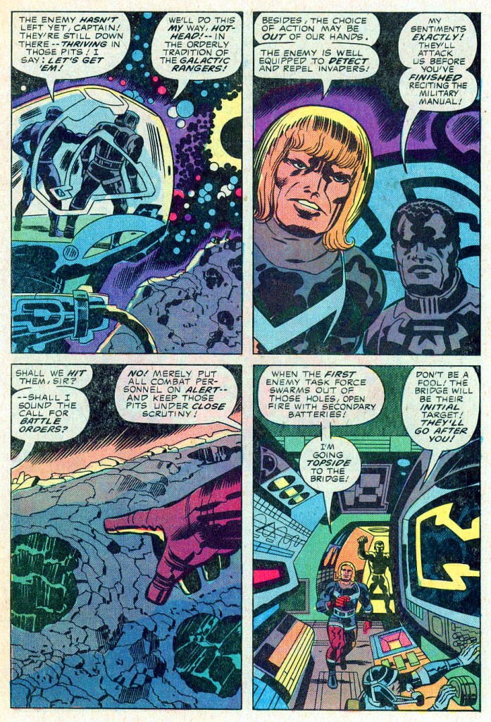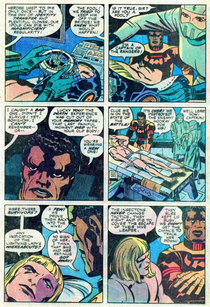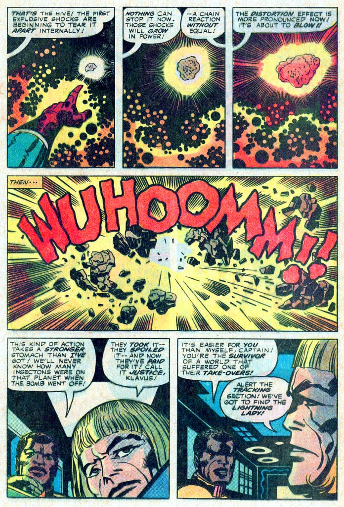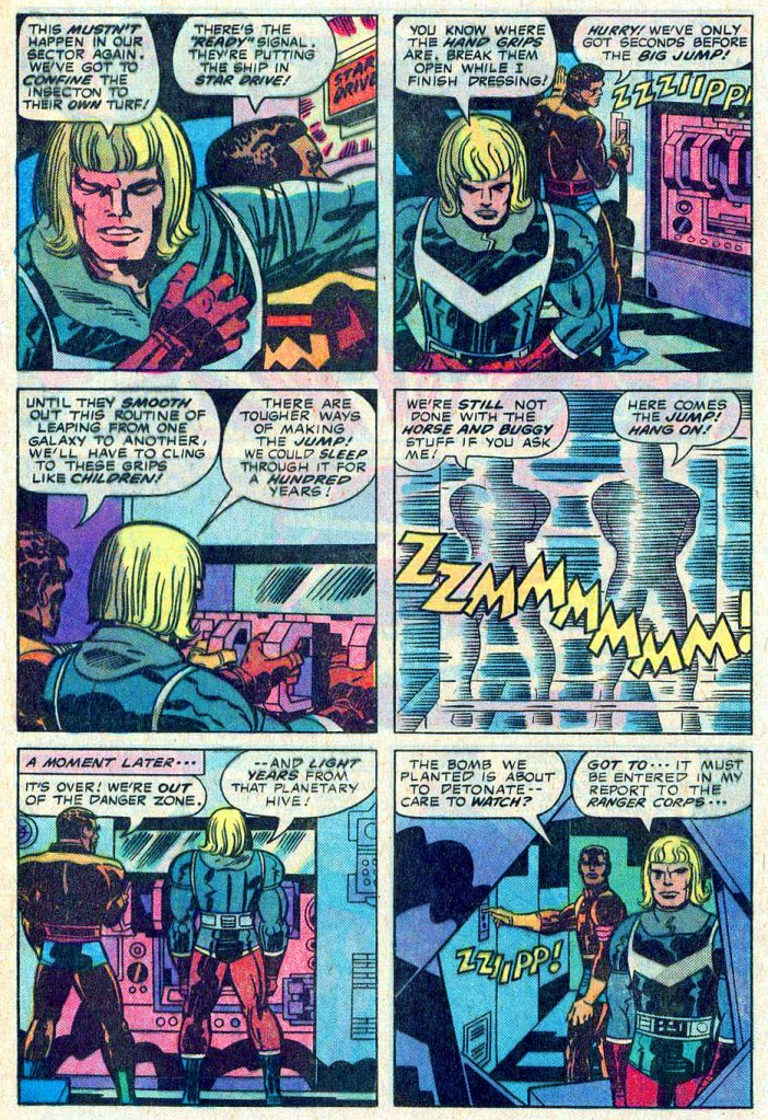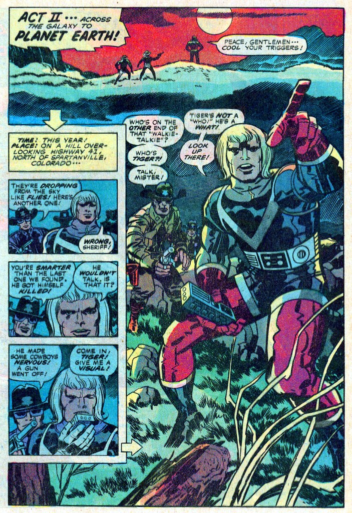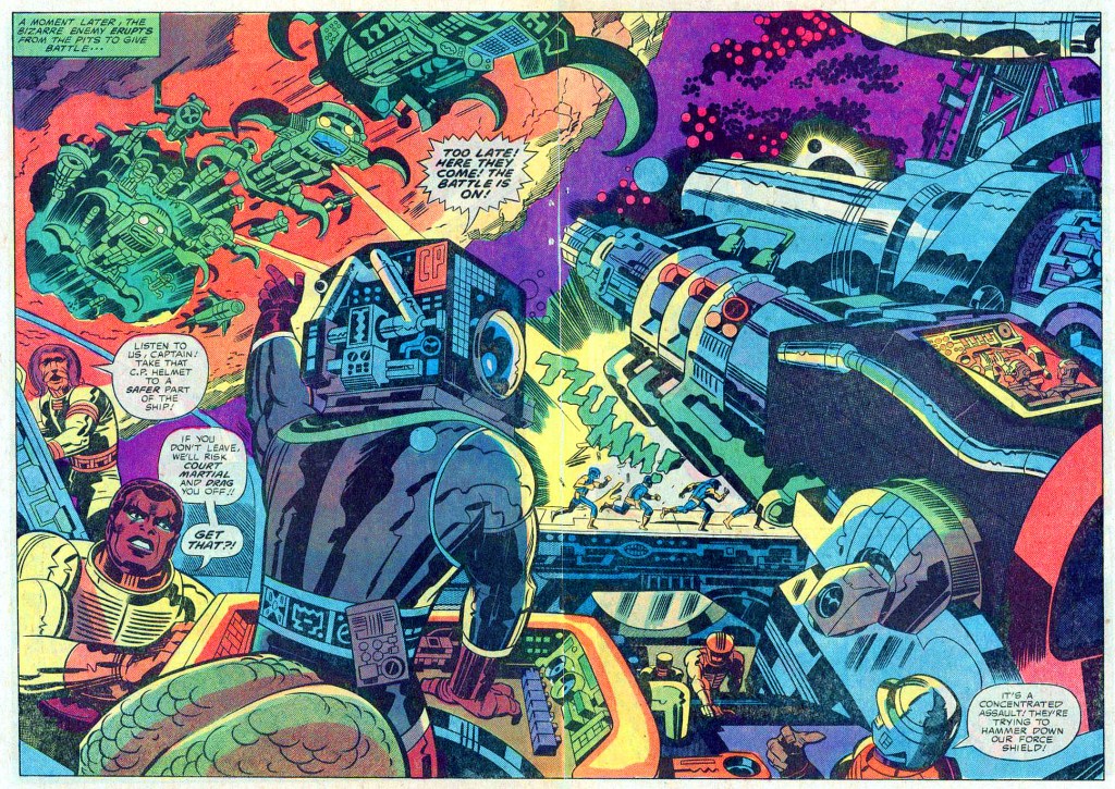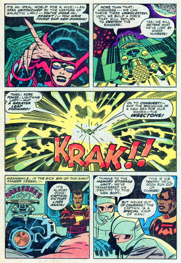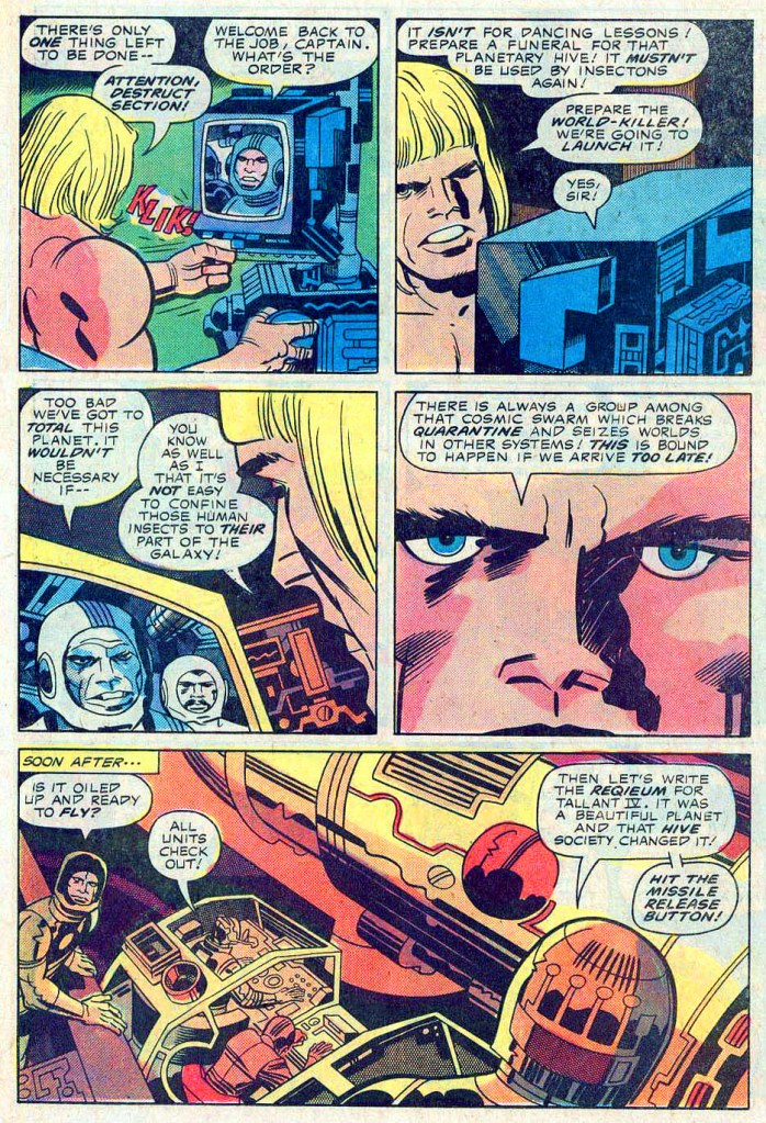 As with much of his work in the 1970s, on the surface CAPTAIN VICTORY looked like a super hero series. But it wasn’t, not really. Nor was it, strictly speaking, science fiction, though it contained a liberal use of super-science and far-out technology. But really, when you looked under the hood, CAPTAIN VICTORY was really a war comic, depicting the struggle between the Galactic Rangers, sentinels of civilization throughout the cosmos, and their enemies the Insectons, who would infest a planet and consume it from within. Earth was the setting for this intergalactic war (much as it had been during Kirby’s NEW GODS saga) but the terms and the turf were interplanetary.