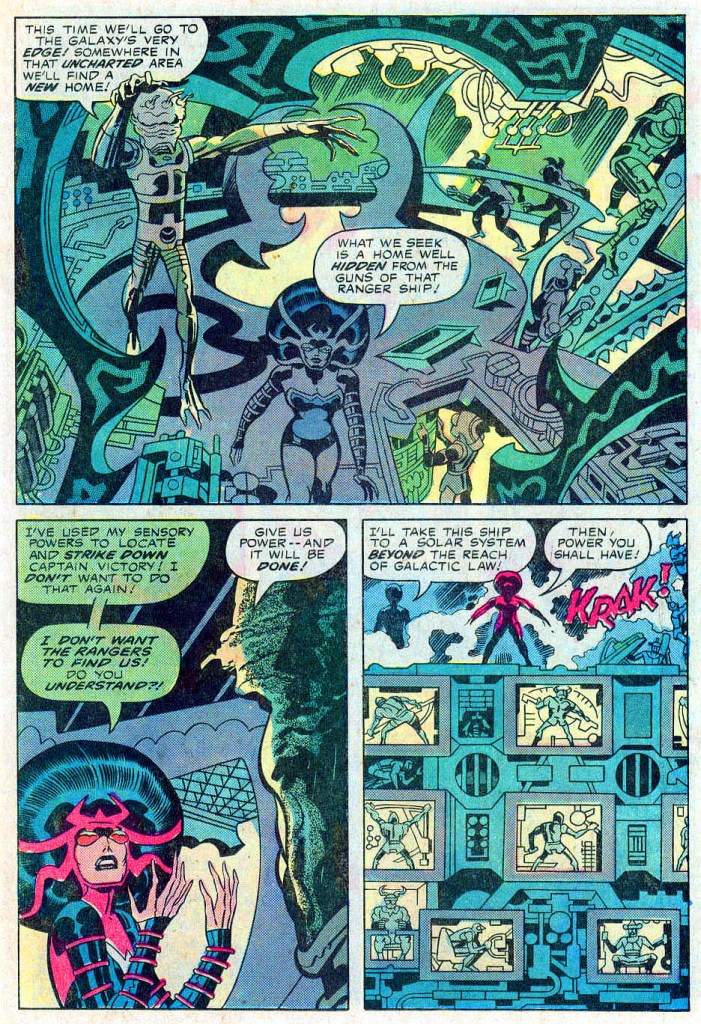 CAPTAIN VICTORY was inspired in part by the success of the movie CLOSE ENCOUNTERS OF THE THIRD KIND, which postulated that contact with beings from another world would lead to them benevolently welcoming humanity into the intergalactic community and sharing their wonderous technology with us. Kirby felt that this was fairy tale thinking. He knew from history that when two cultures come into contact with one another, the technologically superior of the two tends to wind up dominating and subjugating the lesser. So he thought that the message of CLOSE ENCOUNTERS was flawed, and intended to put forward his own rebuttal in the pages of CAPTAIN VICTORY.