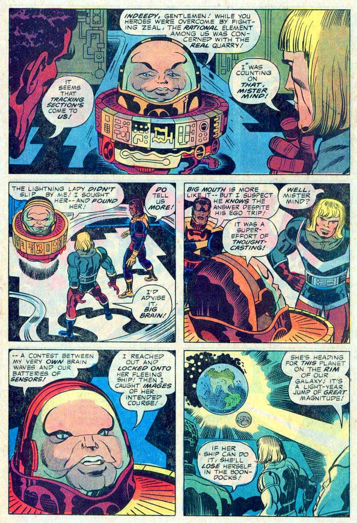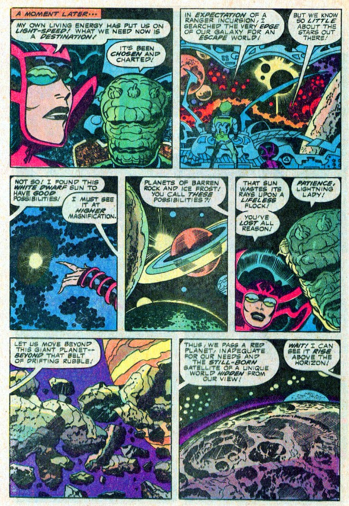 Because it had mostly been prepared earlier, this first issue of CAPTAIN VICTORY was inked and lettered by Mike Royer, Kirby’s inker of choice for most of the 1970s, who always rendered the King’s work faithfully and with precision. Later issues, though, didn’t benefit from Royer’s touch as he had a day job of his own that he needed to devote himself to. So the quality of the rendering diminished as the series went along, with less skilled inkers taking their brush to Kirby’s work.