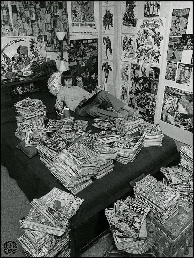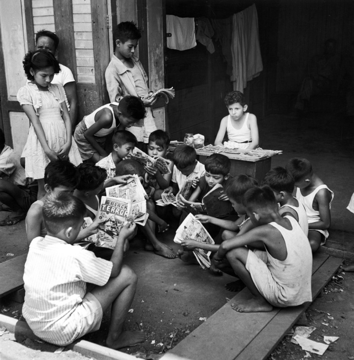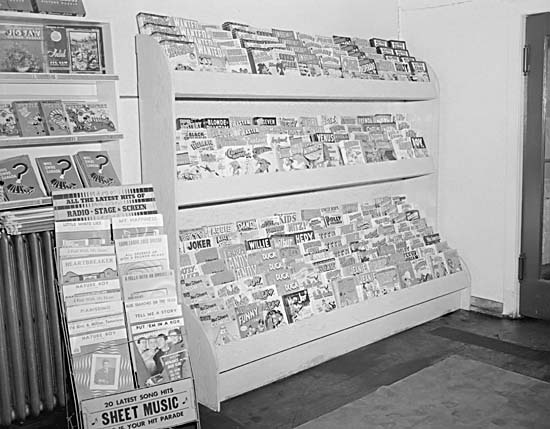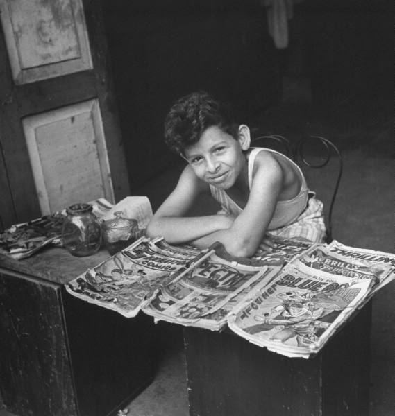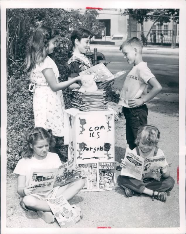 As I mentioned earlier, one of the things I collect from hither and yon is photographs of comic books being either sold or read, particularly ones from years ago. They give a unique glimpse into just how and where the books were sold, and tend to fire the imagination in a nostalgic way. Everybody can remember times that they bought an especially good comic book, after all. So here are some more photos from the past: