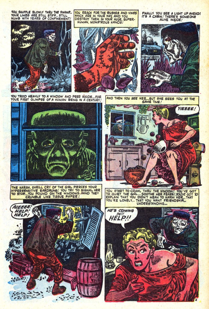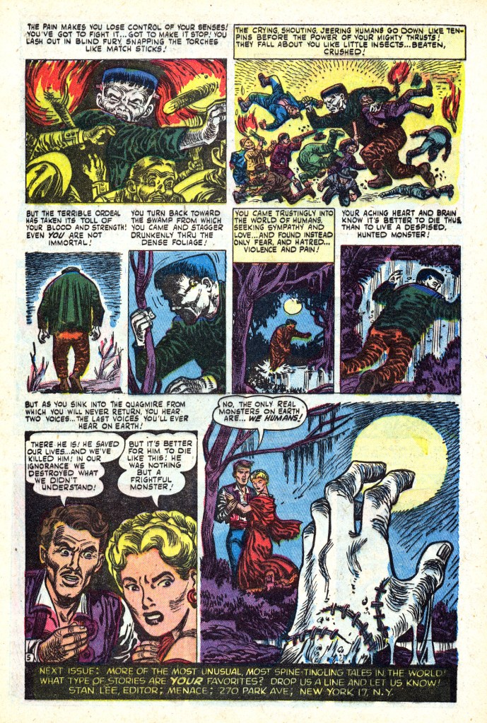 Over the years, Lee had often spoken about how his inspiration for the depiction of the Hulk came from the classic Frankenstein films, and his take-away from them that the monster wasn’t the bad guy; he was misunderstood, hounded by humanity, driven to extreme by fearful villagers. This is exactly the point of view Lee takes in this short story, where he has the Frankenstein Monster return from being buried deep within the Earth to find a human race that is still not ready to accept him.