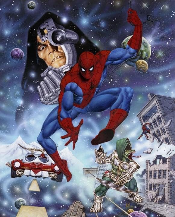 Painter Joe Jusko, then only starting his career working for Marvel, had painted the cover for what would have been the debut of Japanese Spider-Man in MARVEL PREVIEW #20. It’s shown above–and remained hidden in the archives at Marvel for more than 30 years before somebody came across the transparency and I recognized what it was. Joe recently posted the much better scan of the painting that you see above to social media.