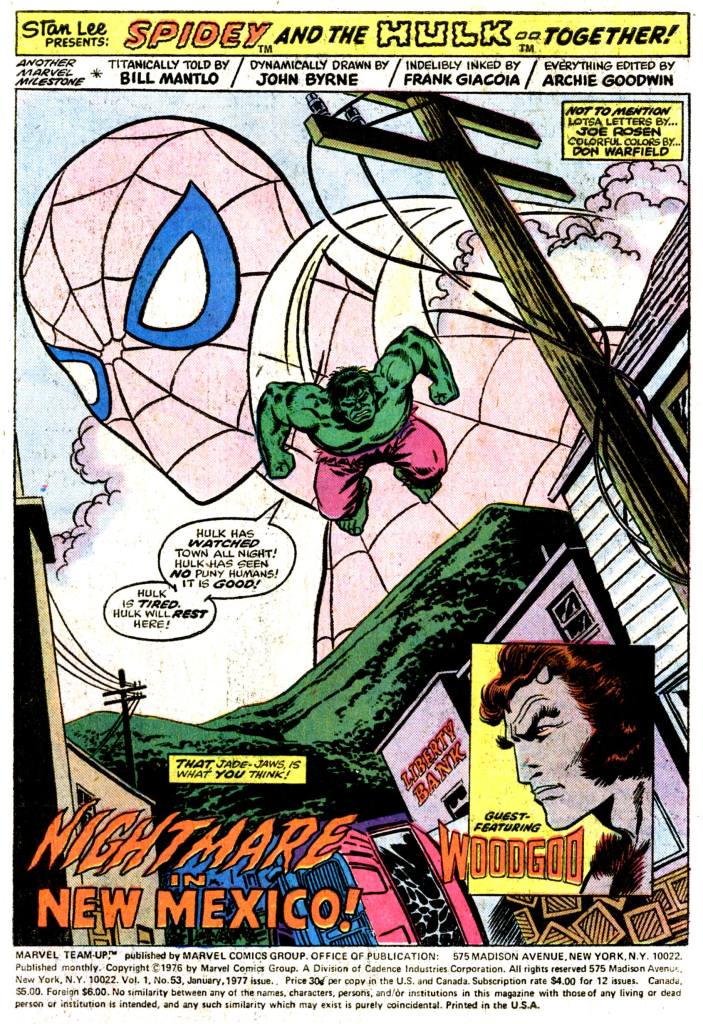 And why are the New X-Men in this issue of MARVEL TEAM-UP? Well, writer Bill Mantlo was attempting to make TEAM-UP feel more like the rest of the Marvel line, and that meant extended storylines and issue-to-issue continuity. The New X-Men had teamed up with Spidey in the then-recent MARVEL TEAM-UP ANNUAL #1, so even though that adventure was a one-off, Mantlo decided to tie it into the ongoing continuity of the title. It was also a good excuse to get the web-slinger way out west, where he’d need to be in order to encounter both the Hulk and Mantlo’s creation, Woodgod. Woodgod had turned up in a single issue of MARVEL PREMIERE, but Mantlo clearly had further ideas for him, and so chose to feature him in two issues of TEAM-UP. But somebody clearly thought that Woodgod wasn’t enough of a sales draw, as in violation of TEAM-UP protocol, the Hulk wound up headlining alongside Spider-Man for two issues in a row. Honestly, that was probably a smart play.