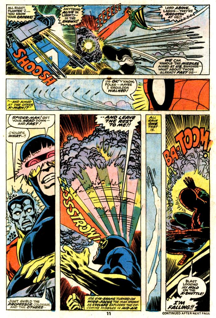 Meanwhile, Spider-Man and the X-Men are flying back to New York from their adventure in the Annual, and they move into the airspace of the same town. When they do, they find themselves being buzzed by flying craft manned by men in hazmat suits–which seems pretty hostile. But these are the X-Men they’re targeting, and Cyclops is able to easily blast the missiles fired at them with his optic blasts (in a panel swiped by Byrne from Neal Adams.) In the aftermath, the good guys are able to listen in on broadcasts from the fliers’ base, and learn that the area had been a quarantine zone of some sort–but one that’s been already breached by the Hulk and Woodgod. Smelling a story that J. Jonah Jameson would pay good money to run, Spidey asks the X-Men to drop him off here, and so Banshee escorts the web-slinger to the ground below. Why the rest of the X-Men go merrily on their way at this point after almost being shot out of the sky must be chalked up to the fact that this story was already crowded enough with super-heroic players, and leave it at that. And hey, they were used to being hated and feared, right?