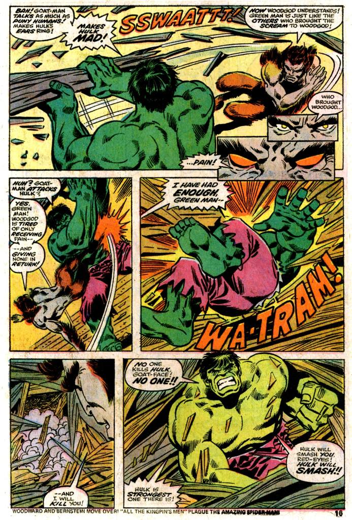 The issue opens on the aforementioned Hulk leaping around in the midwest. He’s come across what seems to be a deserted town, and after watching it for a while and seeing no puny humans milling about in it, he decides to claim it for his own. But when he heads into the town, and finds an overturned truck, the Hulk rights it–and a dead body falls out, one with no obvious indication of cause of death. The Hulk isn’t much of a deep thinker, though–so it’s probably just as well that at that very moment he is attacked by Woodgod, who has himself been holing up in the town. Woodgod is similarly childlike, but he’s obsessed with death, which he calls “Scream”, and he assumes the Hulk is responsible for whatever wiped out that one driver and everybody else in the little village.