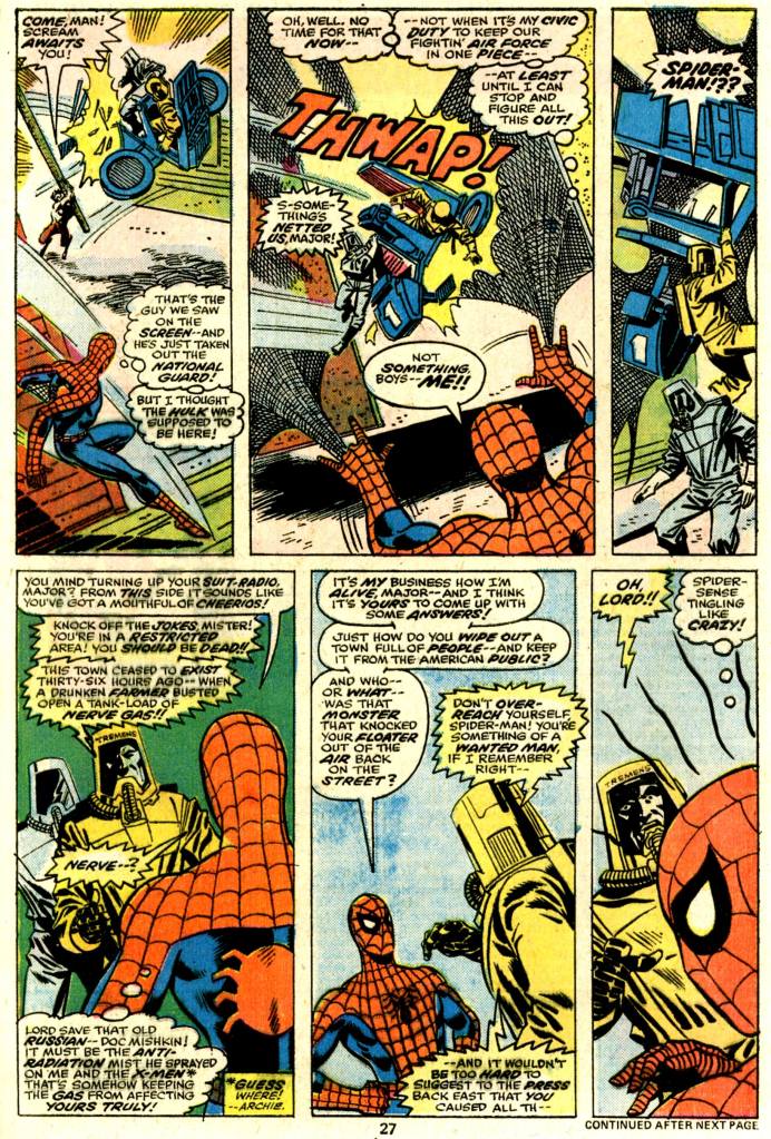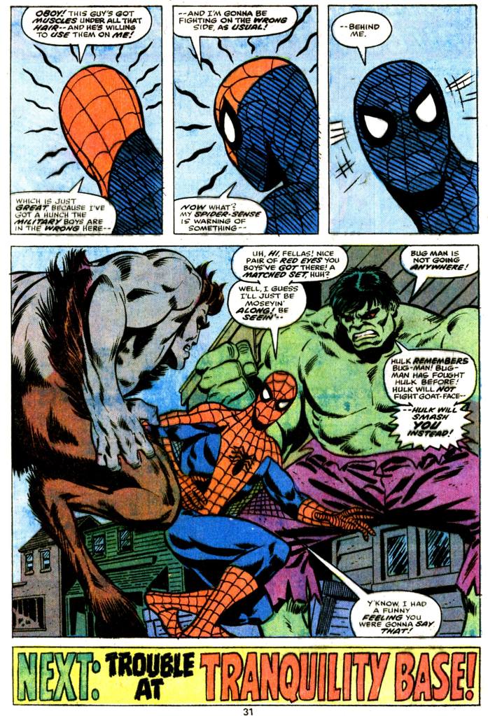 But the uneasy conversation is broken as Woodgod resumes his attack–and Spidey sees Bruce Banner’s unconscious figure further inside the town. Spidey’s still not certain who is in the right and the wrong here–where did that cannister of nerve gas come from in the first place and how did the farmer get it? But he’s not about to be a punching bag for the satyr-like Woodgod. Unfortunately for the wall-crawler as the issue comes to a close, Bruce Banner awakens, and almost instantaneously transforms into his incredible alter ego. The Hulk recognizes Spider-Man, and not as a friend–so as the story goes To Be Continued, Spidey finds himself caught in the middle between two opponents.