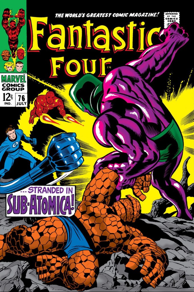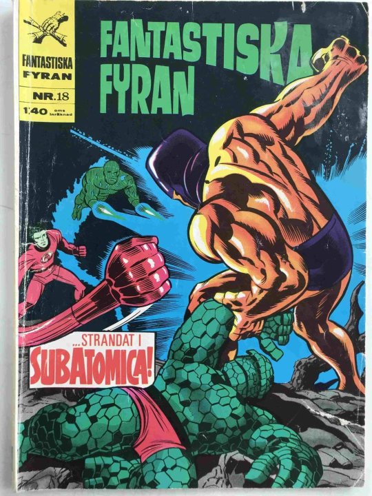 I ran across this Swedish printing of FANTASTIC FOUR #76 in my travels, and thought I’d share it. As happened on a not-infrequent basis, the local publisher, either by accident or because they were unfamiliar with what the colors of the characters were supposed to be, inadvertently switched the film for the yellow and cyan plates here, making everything come out weird and bizarre.