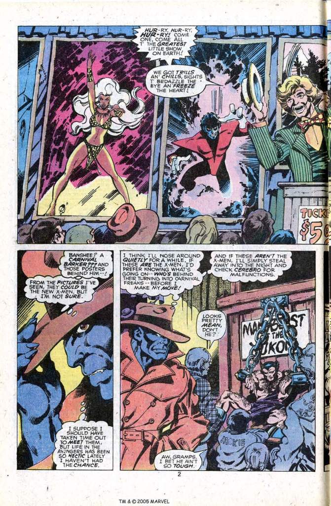 This is the version of the Beast that I grew up with and still the one that I like the best–the character design, the personality, the whole package. The character has moved away from this interpretation over the past 30 years to the point where this depiction might be virtually unrecognizable to a reader of today who’d only been following the character for ten years or so. But I dug him this way. Anyway, the Beast prowls around the circus incognito, taking in a performance by “Ms Destiny” who is clearly Jean Grey. But when Hank goes to confront her about this, she has no memory of him and seems to have a completely different personality–and she calls for one of the roustabouts, “Slim”, to have him ejected. Slim is of course Cyclops, but he has no more recollection of the Beast that Jean does, and while the agile mutant is able to knock him on his backside and get away, this leads to a protracted chase through the fairgrounds.