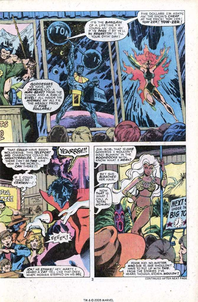 The story is a pretty amazing case of starting things off en media res. Byrne was a big fan of the original incarnation of the team, and so it seems likely that it was his influence that led to the Beast, who had moved on to become a fixture in AVENGERS, being the point of view character. The issue opens with Hank McCoy locating the missing X-Men in a strange circus in Texas, where they’re being paraded out as freaks and performers. This issue also intersects with a pair of MARVEL TEAM-UP stories that Claremont and Byrne worked on, during the course of which the Beast discovered that the X-Men had vanished. After wrapping up that adventure with Havok, Spider-Man and Thor, the Beast used Cerebro to determine his friends’ location, and he headed down to Texas to figure out what was going on. But he’s astonished to see his school partners (and the new team members whom he hasn’t truly met yet) in such dire condition.