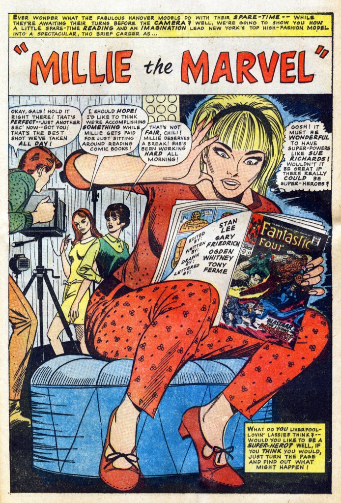 She’s still in the Marvel Universe and has appeared in Models Inc, 15 Love, and Patsy Walker Hellcat. The Fantastic Four having a comic book inside the Marvel Universe was established early in their series, so it’s bizarre having Millie not know that superheroes exist in her world.