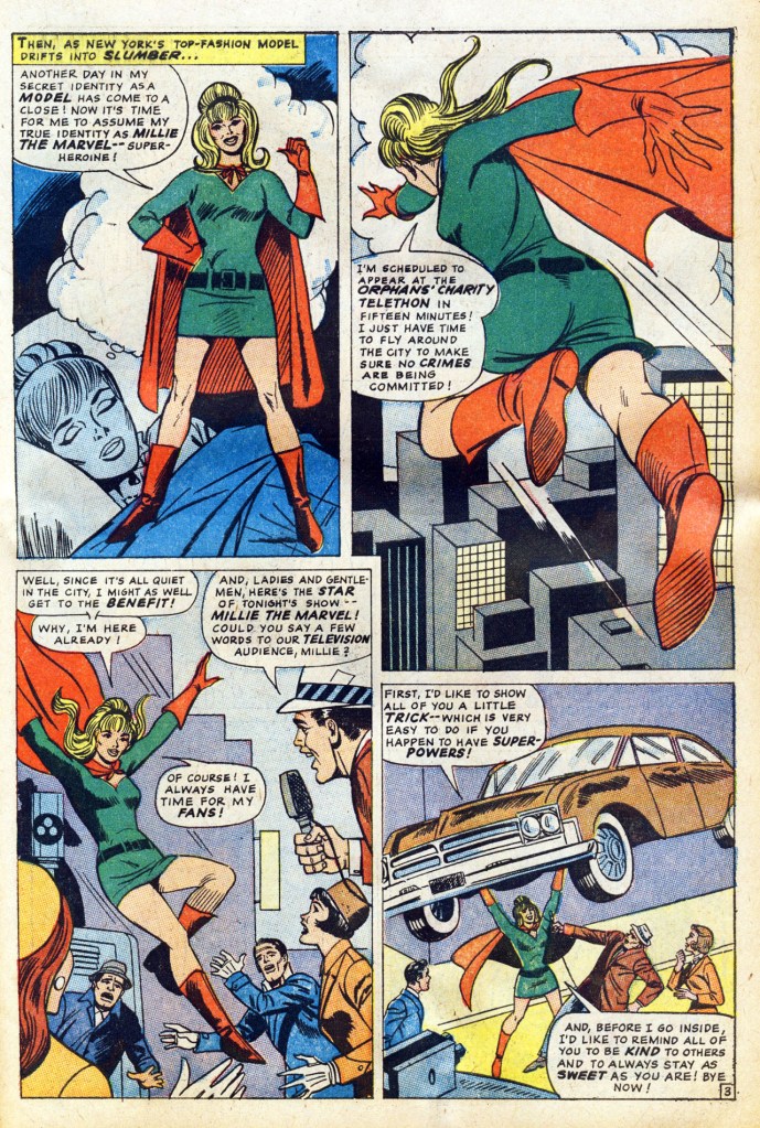 It’s interesting to see that unlike the regular Marvel characters at the time, Millie had no trouble integrating her crime-fighting activities with her everyday modelling gigs. No “character with problems” here!