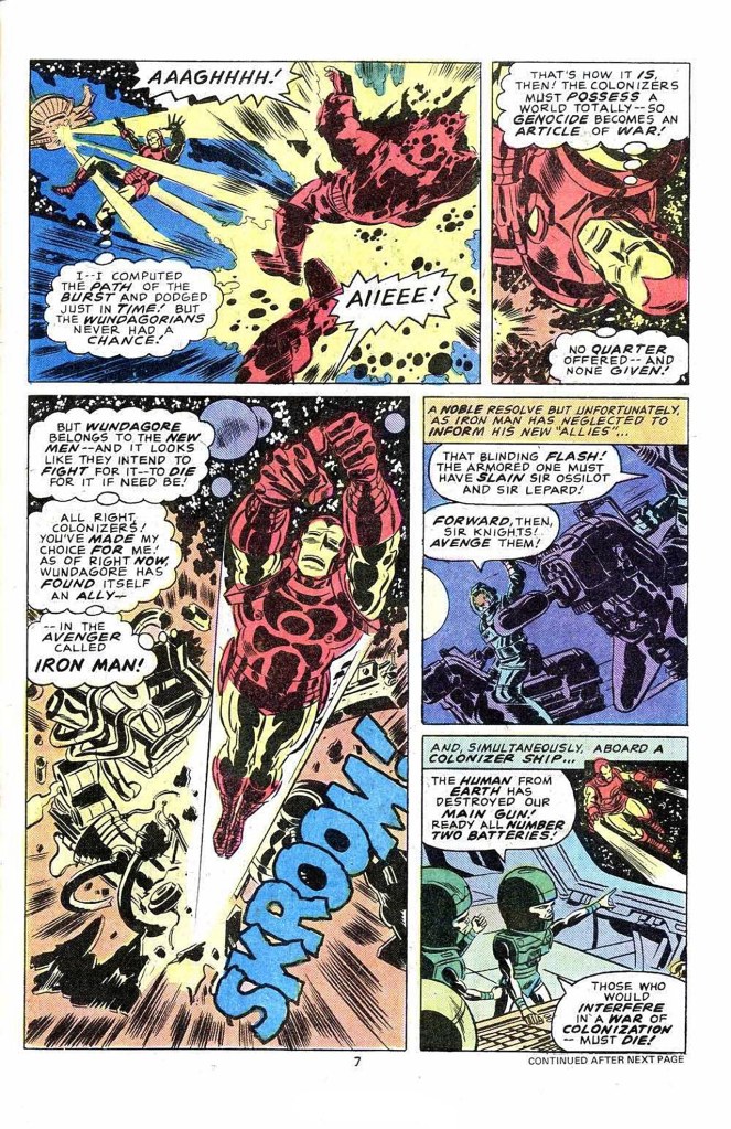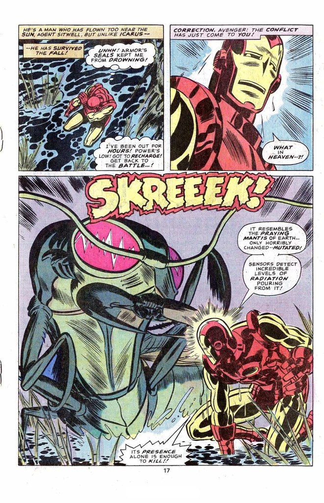 Elsewhere, Iron Man has recovered from his fall to the planet, but as he gathers his wits, he’s immediately attacked by a giant Preying Mantis monster, like the one showcased on the cover. This thing has also been evolved by conditions on the planet, but it’s still a mindless bug, and so Iron Man has to fight for his life–which he does. Shellhead is able to drive it off, but not before seriously depleting his armor’s power reserves. So he’s in no position to fight back when a patrol of New Men stumble upon them. As he feels a kinship with the position of the New Men, Iron man allows himself to be taken to one of their cities for questioning. He also surreptitiously plugs his armor into the power cells from their vehicle to pick up a quick recharge.