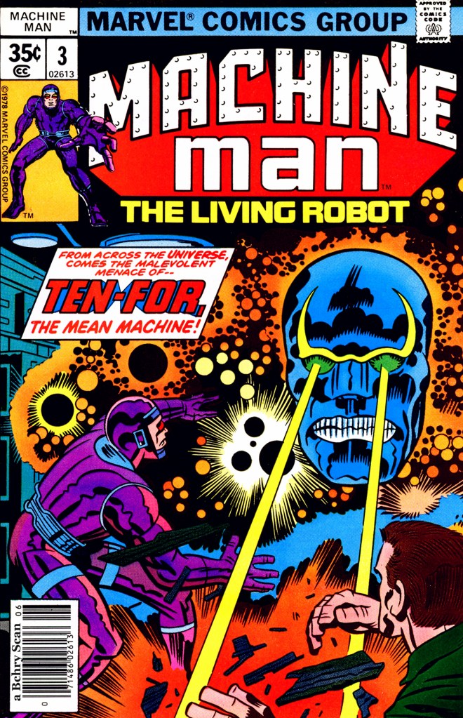 Horrified by what he has unleashed, Machine Man suggests that Ten-For can be dispatched equally easily with the Instrument, and so the Autocron immediately incinerates it. Just at that moment, Kragg chooses to open fire, and his attack is interpreted as a deliberate provocation by Ten-For. He identifies himself as a Holocaust Specialist, and he immobilizes Machine Man with a vertigo inducer that severs the connection between Stack’s mind and his body. Ten-For then turns his attentions outside, where the military is waiting for a fight they don’t really know is coming. Shaking off his paralysis, Spaulding attempts to dislodge the vertigo inducer from where it has been locked to Machine Man’s head–Aaron can still see and speak, but he’s terrified by the awesome power that Ten-For represents, and knows that it’s urgent that the Autocron be dealt with, defeated and ejected from the Earth, before he can summon the rest of his kind. And it’s on that note that the issue is To Be Continued. I enjoyed it a fair amount as a kid, even though I found a lot of the copy a bit stilted and unwieldy. but I thought Ten-For was cool, as was Machine Man (despite the fact that I couldn’t quite figure out what his powers were, As was typical of Kirby in this era, he didn’t care about quantifying matters such as that, so Machine Man could often pull whatever gadget the story called for out of his inner workings.)