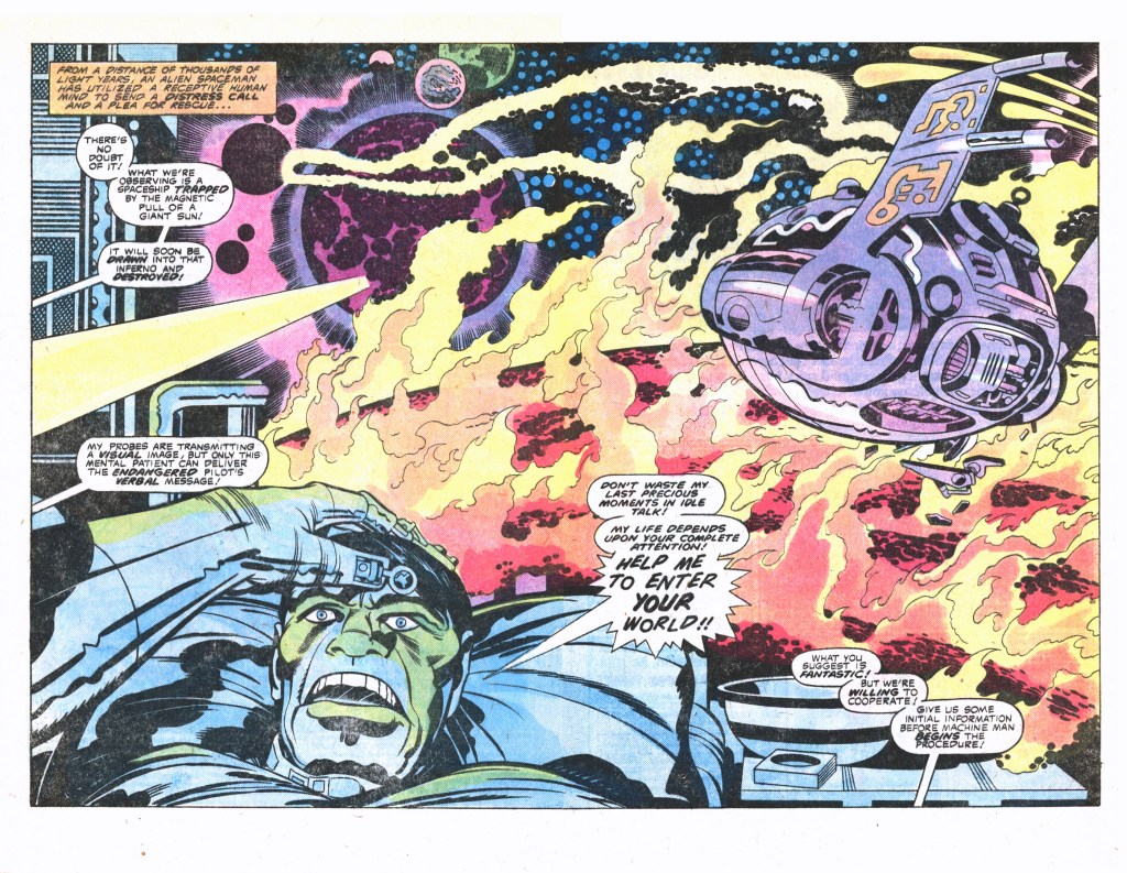 MACHINE MAN concerned itself with the adventures of X-51, Aaron Stack, the fifty-first experimental robot created by Doctor Abel Stack and the only one whose positronic personality didn’t go insane. The difference being that Stack raised X-51 like his own child, treating him like a son and fostering his development slowly. Still, Aaron Stack was a stranger in a strange land, and after his father died and the project was shut down, he was pursued in true Thunderbolt Ross fashion by the vengeful Colonel Kragg, who considered Machine Man a menace and who had himself lost an eye in the service of the X-Series project. There isn’t a whole lot of preamble in this issue before Kirby jumps into the story. Apparently, last issue, Machine man and his friend Dr. Spaulding came into contact with an individual whose mind had made contact with an entity from outer space. In the opening, Machine Man uses the technology built into his body to project images from the man’s mind–the being that’s in contact with him is trapped on a ship that’s about to plunge into a star, and can only be rescued by them by means of dimensional transference.