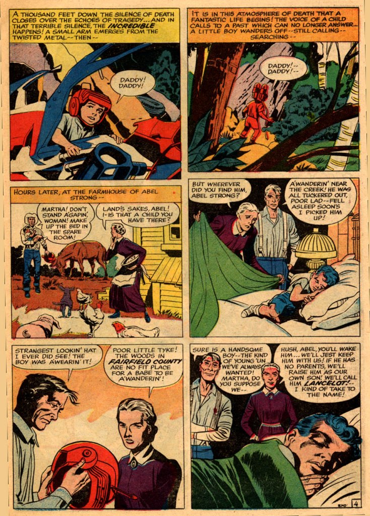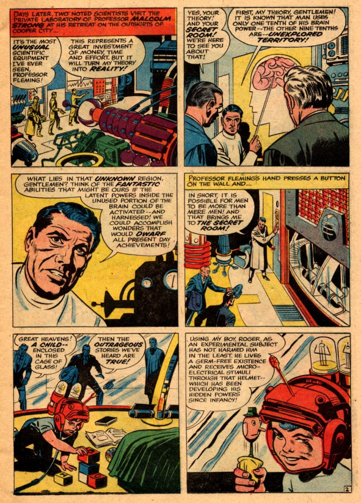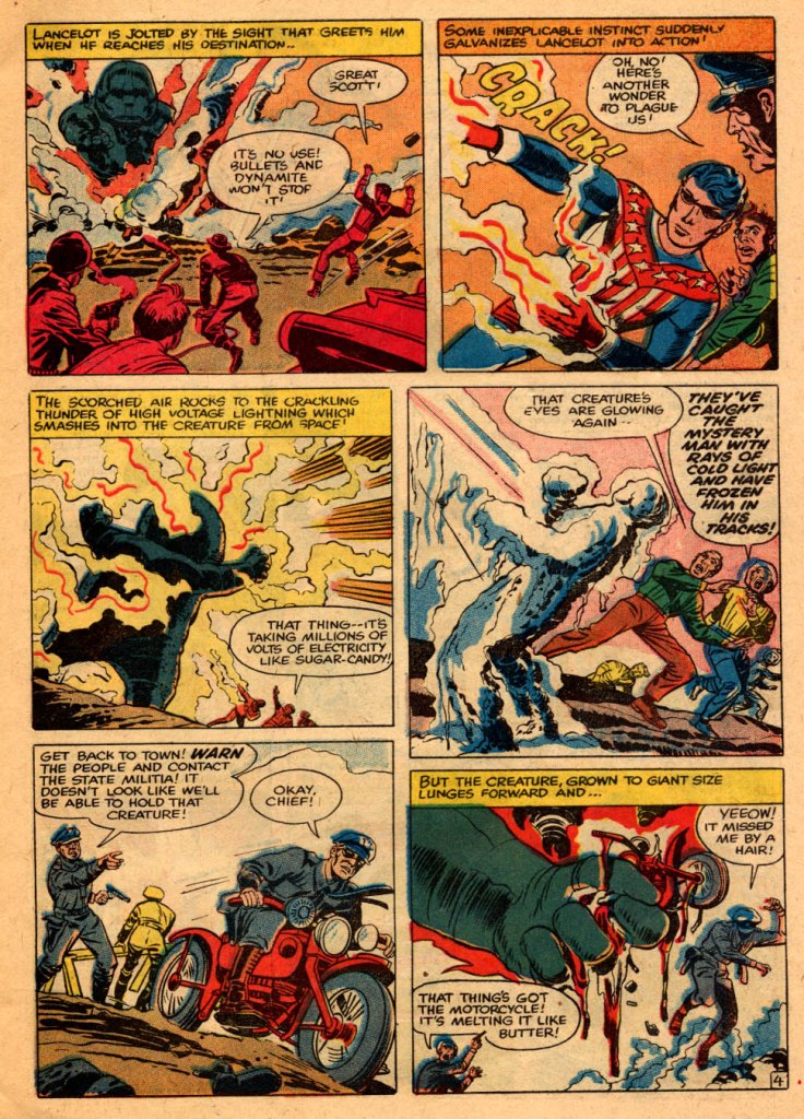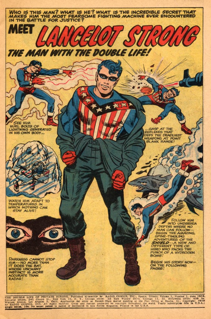 The end result was the first modern exploitation of Jack Kirby’s imagination on a Silver Age super hero character. The duo envisioned their new Shield as a military man in the mold of Steve Rogers, an army private who would secretly be a patriotic-themed hero. But that’s about where the resemblance ends. In the tradition of Doc Savage, Lancelot Strong was raised in isolation by his scientist father (alternately named Malcolm Strong and Professor Fleming, in an instance where it seems like something was changed mid-stream.), who used advanced techniques to give his offspring incredible abilities by allowing him to utilize the total power of his brain, rather than just a fraction. The presentation of this origin was much more plausibly built and rationalized than most Golden Age heroes, including the previous Shield. Simon and Kirby also redesigned the Shield’s costume, bringing him more in line with their aesthetic.