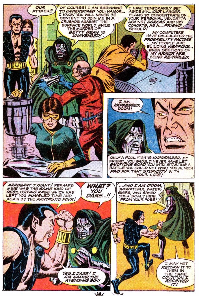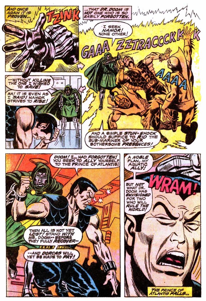 For his own reasons, Doom wants to make an ally of the Sub-Mariner, but he realizes that until Betty Dean is avenged, Namor’s not going to be open to thinking about anything else. So Doom makes the Sub-Mariner’s cause his own, planning their assault on Hydrobase, which is under the control of the three villains. A bunch of Namor’s friends, transformed into amphibians, are being held there, so their strategy must allow for the safety of the hostages first. Per Doom’s strategy, the duo splits up, with Doom directly engaging their foes while the Sub-Mariner liberates his captive friends. Then, with no leverage held against them, Namor is able to join the attack himself directly. But Subbie is a proud man, and even though he’s been armed with a weapon by Doom that will encase Dorcas, Tiger Shark and Attuma in an unbreakable energy shell, this outcome isn’t satisfying to the Prince of the Deep, who wants to make the villains pay with his own two hands. So before they’re incapacitated, Namor destroys his own weapon, and instead launches himself at them, to pummel them physically.