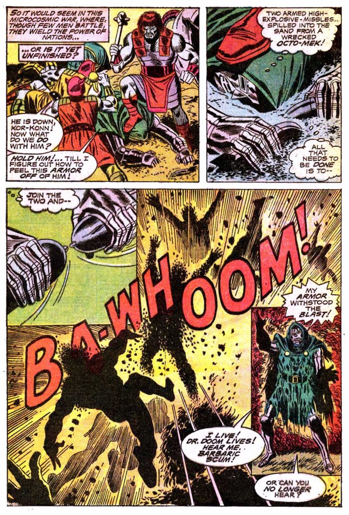 Doom, however, stands alone against Attuma’s barbarian hordes as well as the high-tech Octo-Mechs created by Dr Dorcas. He calculated this eventuality, counting on the Sub-Mariner’s appearance to turn the tide. But when Namor doesn’t show, embroiled in his own personal revenge against his foes, Doom himself is on the verge of being overwhelmed, his armor’s energy reserved sorely depleted. One of the Barbarians even makes sport of Doom as his fellows overwhelm the Monarch of Latveria, casting him bodily to the ground. But Doom still had an ace up his sleeve. Having snatched up some ordinance from a downed Octo-Mech, he sets it off at ground zero, depending on his own armor to allow him to survive the blast while his assailants will not.