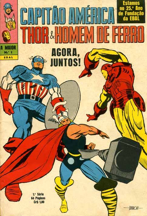 That cover by Baron might be my favorite. Though by putting Thor out in front at the size he’s shown, he could be misinterpreted as either really small, or “Capitao” and Homem de Ferro are just honkin’ huge. Cap’s leg is a little too exaggerated, but it reminds me of the Kirby homages by LaDronn. And that must be Stark’s secret stilt-armor. 😉 Thor, though, is in near perfect form & balance. The figure is spot on, even if the style is deceptively simple. Makes me think a blend of 2 other artists; if Mike Allred had finished a drawing started by Paul Pope…
