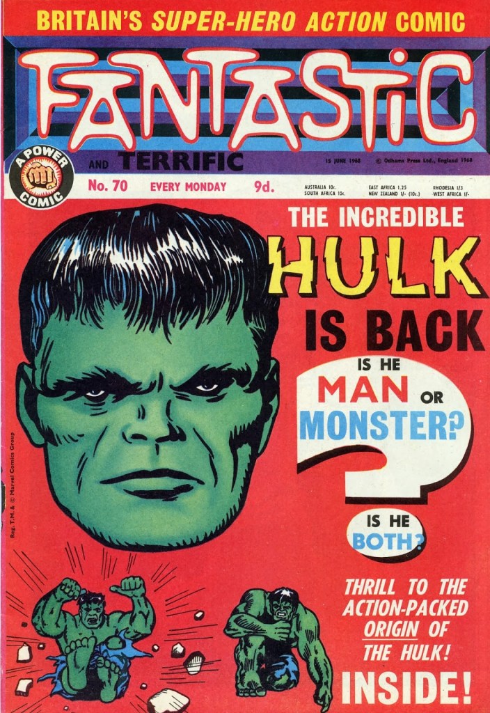 One of the first places that Marvel material appeared in the United Kingdom during the 1960s was in the pages of the weekly comic book series FANTASTIC and TERRIFIC. As was the custom with British weeklies, the two titles were combined after a point. This cover features a Hulk head freely adapted from the cover to INCREDIBLE HULK #1, but colored green here. And based on the blurb, that’s the story that’s reprinted herein as well–though the insides would have been black and white.
