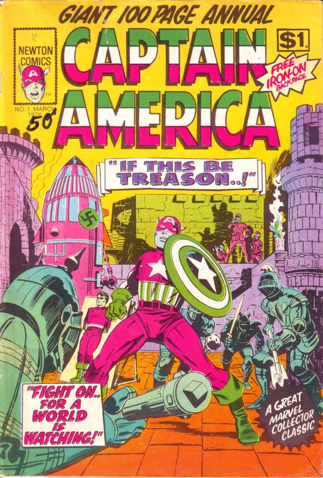 Australia’s Newton Comics would often go hog-wild with their coloring, as in this instance where captain America is screamingly, shockingly magenta. I suspect this may be due to printing plates being accidentally switched in this instance. This piece has almost a luminescent treatment to it–I wonder how it would look under a black light.