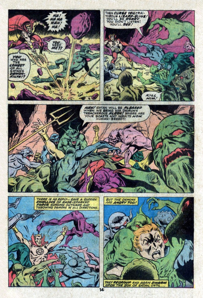 This was another book that I pulled up out of my local drugstore’s Big Bin of Slightly Older Comics, and just like the issue of SUPER-VILLAIN TEAM-UP we talked about last week, this issue was definitely purchased to round out a stack, to get me to that magic number of 5 where each book would cost only 20 cents. Otherwise, I don’t think I would ever have picked up a copy of SON OF SATAN. For one thing, I had no interest in the assorted monster books, any more than I did the western or romance or war books, of which there were always a bunch in the bin. But I suspect that the fact that this was a first issue coupled with the fact that, with that cape, Daimon Hellstrom looked like a super hero (which I’m sure was the intent behind that design) at least enough so that I took a chance on it.