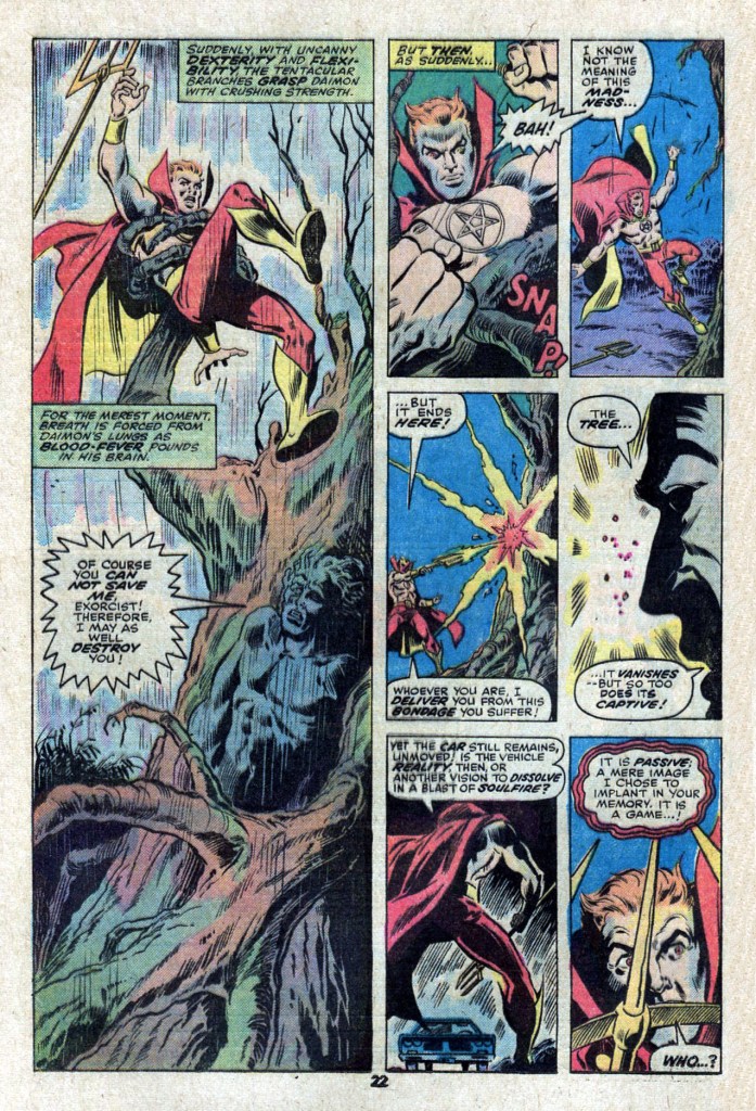 Story-wise, there isn’t much to this issue, which lurches ahead from thing to thing. Returning home to his remote mansion after a long night of demon-fighting, Daimon Hellstrom discovers that his domicile has been defiled. He presumes that his father or his minions are responsible, and so he heads downstairs to a locked door, behind which lies the entranceway to Hell itself. Perambulating into the underworld, Daimon battles a few demons before confronting his Dad, exchanging a few barbs, then returning to the surface. As he emerges, Daimon hears a scream in the night, and heads outside to find its source, a demonic tree which has swallowed the soul of a passerby. Daimon battles the tree, but this is all an illusion created by a hooded foe, and after triumphing, he finds himself back in his home again, confronted by this mysterious enemy.