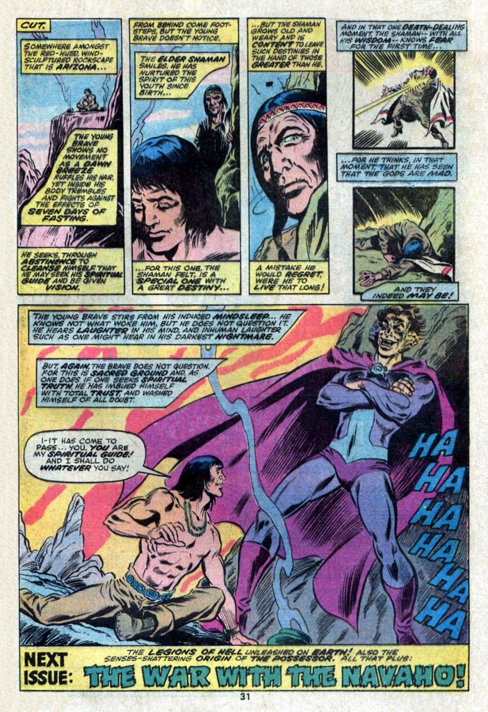 The hooded figure introduces himself as the Possessor, and he and Daimon fight and dance, with the hero eventually unmasking the Possessor to reveal that the villain has absorbed a number of Satan’s demons into his very flesh. Indicating that this has all merely been a preamble to their actual conflict, the Possessor teleports himself away, leaving Daimon befuddled–only for the three-faced man to appear before a Navaho brave who is undergoing a spirit quest. The Navaho takes the Possessor to be his spirit guide and commits to following him wherever he leads–and this will certainly be into conflict with Daimon Hellstrom next issue. To Be Continued! The two panels in the top tier where the Shaman is killed look to my eye to have been a last minute fix–possibly whatever that panel had originally shown may have been too graphic for the tastes of the Comics Code.