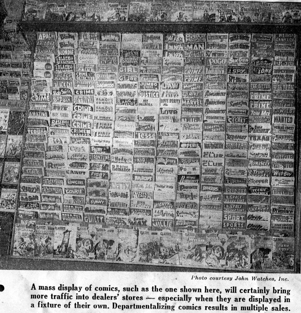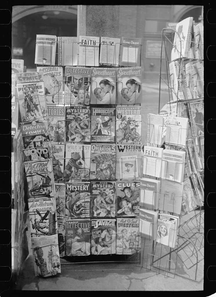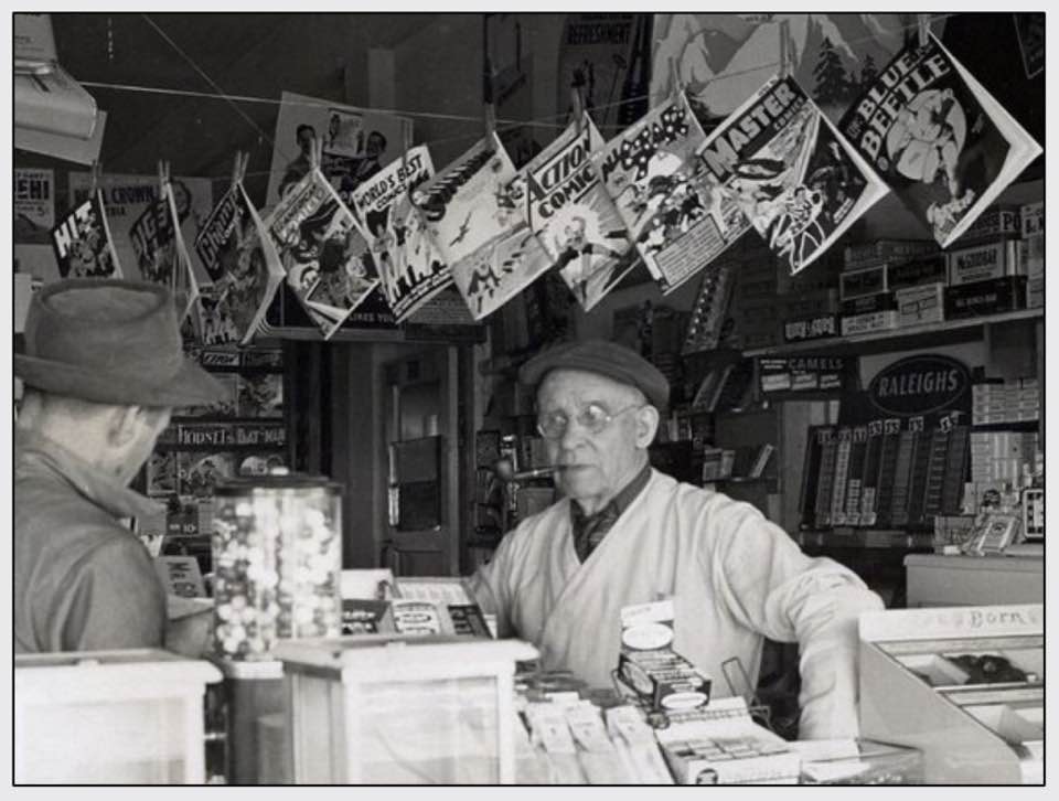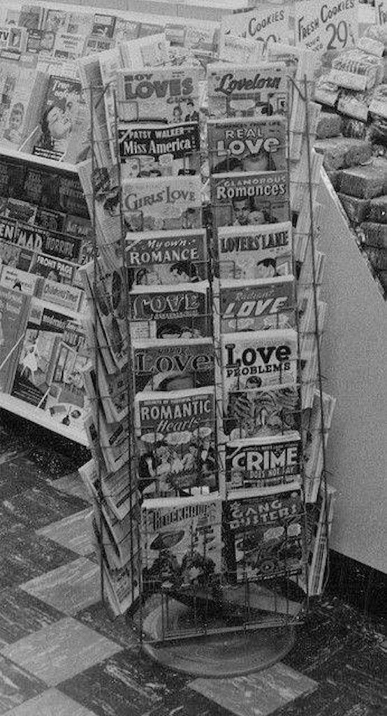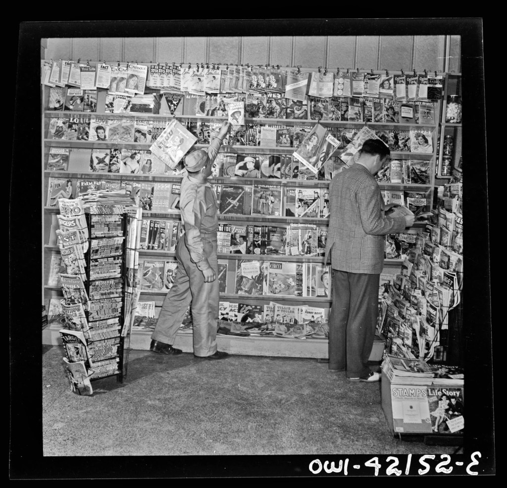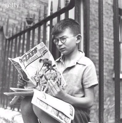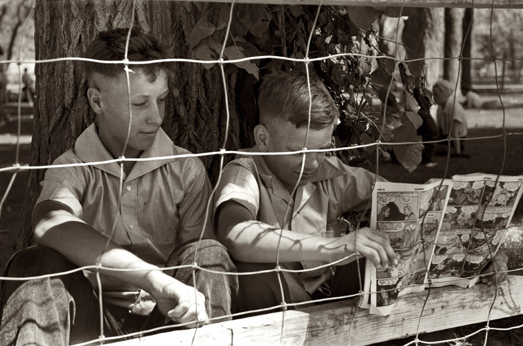 I just ran across a bunch more of these, so here’s another batch of photographs from the past either showcasing comic books on sale in their native time or else old comics being read by the audience of their era.