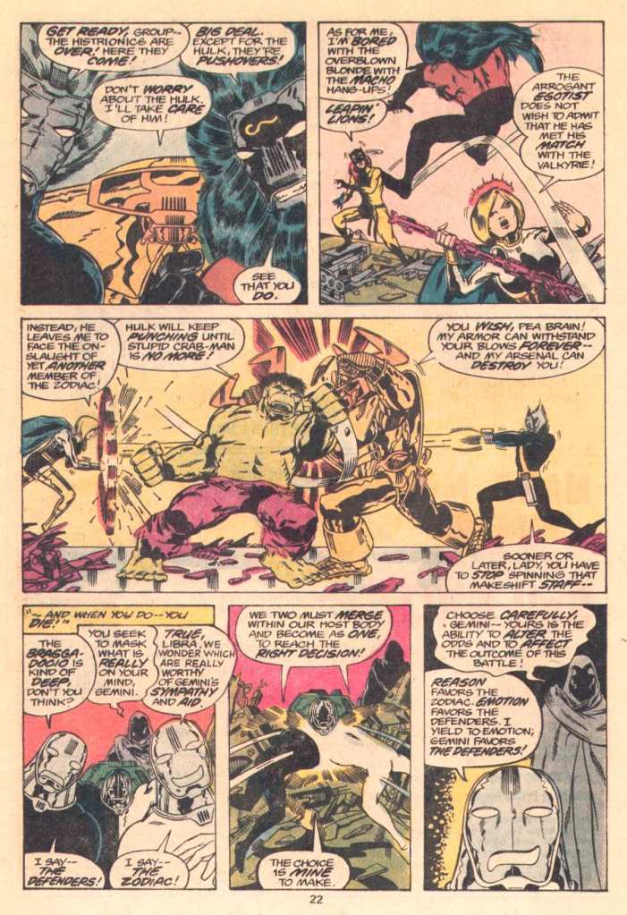 It was Kraft who spent a bunch of time and effort investing in Scorpio as a character. His story was all about toxic masculinity, and how Jake Fury considered himself a self-loathing failure because he could never live up to his older brother’s manliness. Reportedly, this was as close as Kraft could come to being able to depict Scorpio as being homosexual, and enough readers got the gist of what he was laying down between the panels that it seems as though he was effective in his efforts. All of that went right over my head as a kid who had no particular awareness of homosexuality (despite the fact that my uncle, my father’s brother, was a closeted gay man. ) Anyway, much of this issue is a huge fight scene after some issues of set-up; Scorpio had created a new Zodiac for himself, and had taken both Kyle Richmond (Nighthawk) and Jack Norriss (the ex-husband of Valkyrie’s host body–not an easy thing to explain quickly) captive, leading the remaining Defenders to mount an assault on his base.