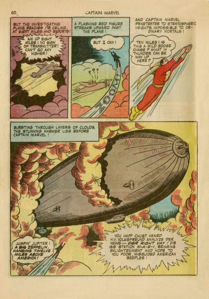 This page in particular takes a very different approach in terms of what the artwork emphasizes and highlights. The storytelling on the Canadian version is a bit awkward as well, with the stacked panels on the left side confusing the reading order of the panels just a bit. The artist chooses to focus much more on Captain Marvel himself rather than the enemy dirigible in the final panel, whereas Costanza takes the opposite approach.
