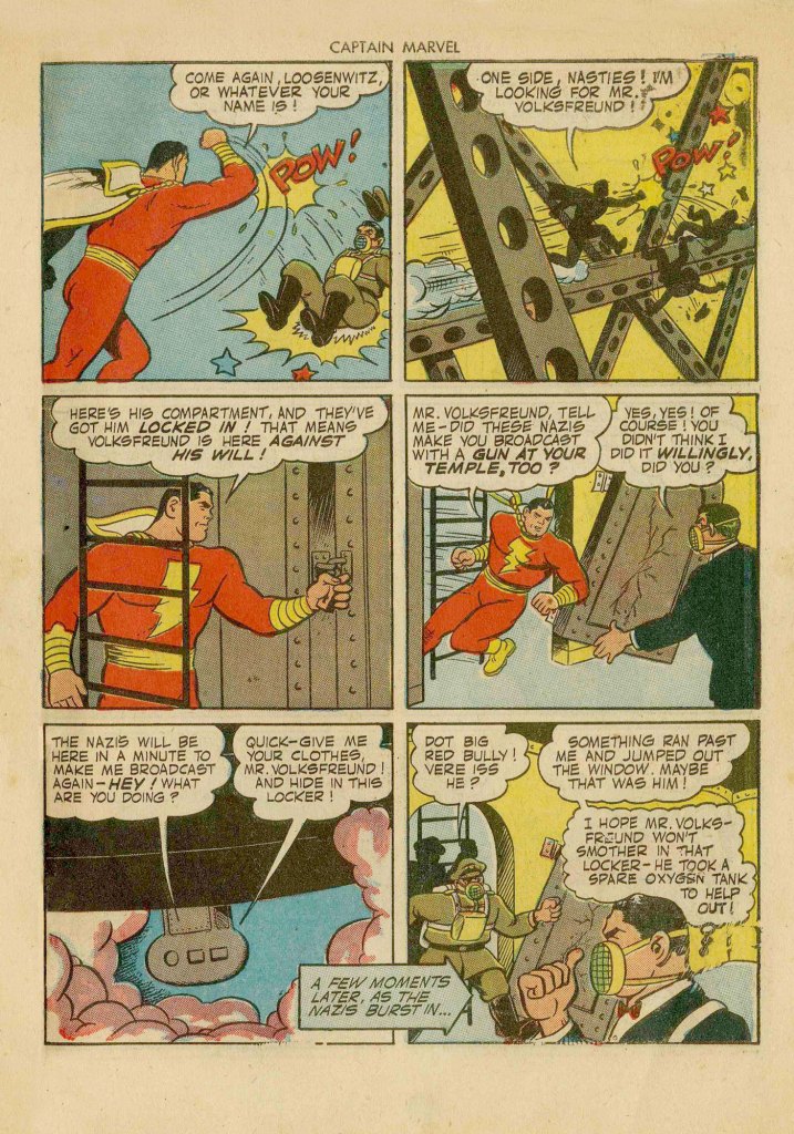 This particular issue of CAPTAIN MARVEL COMICS, #10, contains the Captain Marvel story contents of the Fawcett CAPTAIN MARVEL ADVENTURES #24, all of it redrawn from the original scripts. Comparing the two versions of this story, it’s pretty readily apparent that, while Anglo-American had reference as to what Captain Marvel, Billy Batson and all of their supporting players looked like, the artist involved had no access to the original drawn pages–in this story likely produced by Pete Costanza. so it’s an opportunity to compare and contrast the two storytelling styles.