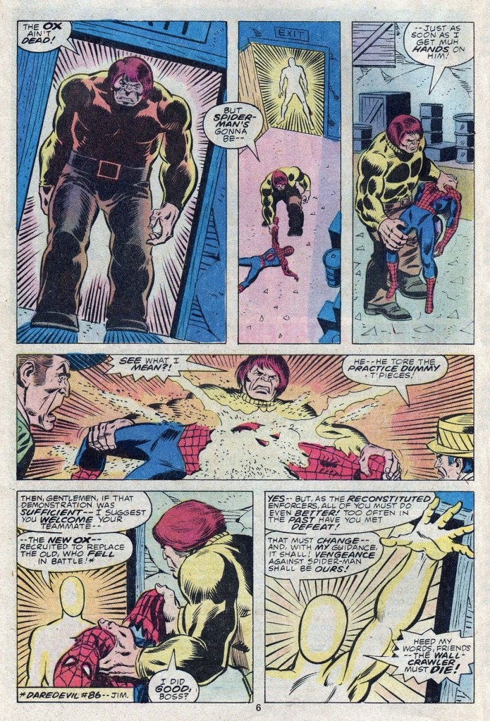 The issue opens on two of the Enforcers, Fancy Dan and Montana, beating the heck out of a Spider-Man dummy for kicks or something. This bit of business is really just here to get us the splash page image, where it seems as though the web-slinger is already on the ropes. Nope! The two Enforcers are waiting around for their mystery boos to show up and give them their instructions. And appear he does–with a replacement for the slain Enforcer, the Ox, in tow! Who is this new Ox? No idea. He’s effectively the old Ox resurrected–he dresses the same, talks the same, acts the same. So we’re seeing some buyer’s remorse over the real Ox having been killed. (And admittedly, the Enforcers weren’t really all that formidable as a little guy who knew some judo and a cowpoke who was good with a lariat.) The boss, still enshrouded in an energy field (though his identity was relatively apparent to anybody who had been reading the series since the beginning–I hadn’t.) announces that their objective will be to murder Spider-Man.
