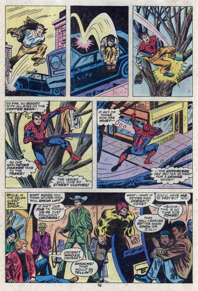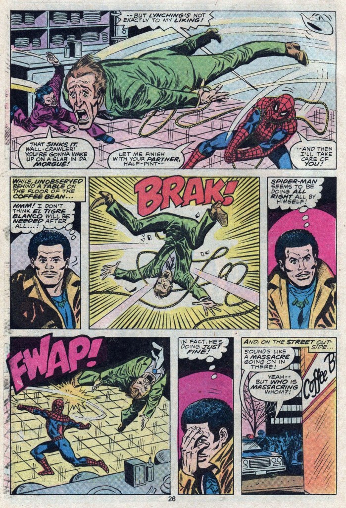 As a step towards doing so, the Enforcers are sent into Manhattan to attack the Coffee Bean, the hangout for Spider-Man’s supporting cast. How anybody connects the place with Spider-Man, though, is a mystery, as I don’t think we really see Spidey there all that often. But this gives Mantlo an opportunity to check in with some of the alternative supporting cast that he’s been building for the wall-crawler in this series. The main series, AMAZING SPIDER-MAN, seemed to be monopolizing the time of Mary Jane and Aunt May and Harry Osborn and such, so Mantlo grabbed a secondary cast of characters for his title: Flash Thompson and his Vietnamese girlfriend Sha Shan, and Hector Ayala, the White Tiger, who had been the star of a strip in DEADLY HANDS OF KUNG FU that Mantlo had written. These kids, plus Hector’s new romantic interest Holly Gillis, are all in attendance when the Enforcers burst into the place and create a hostage situation.