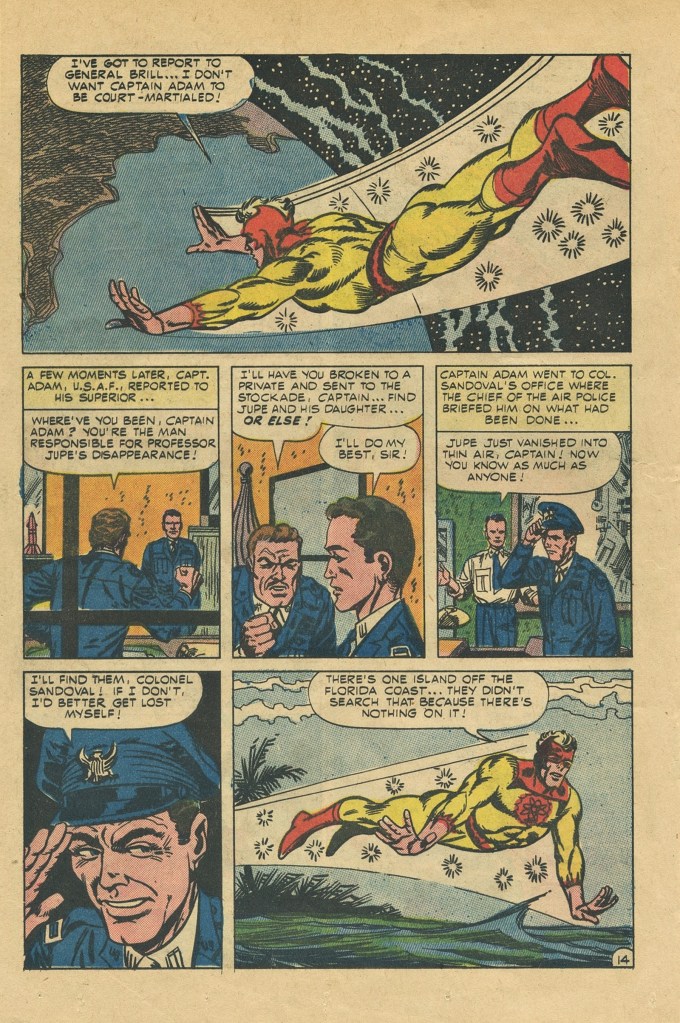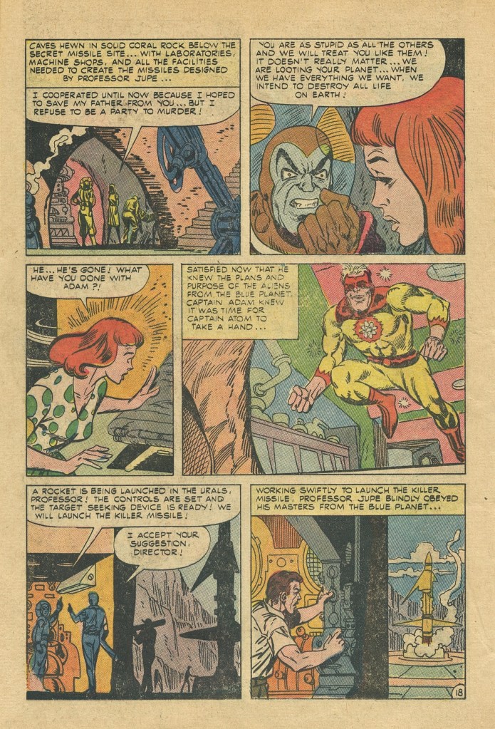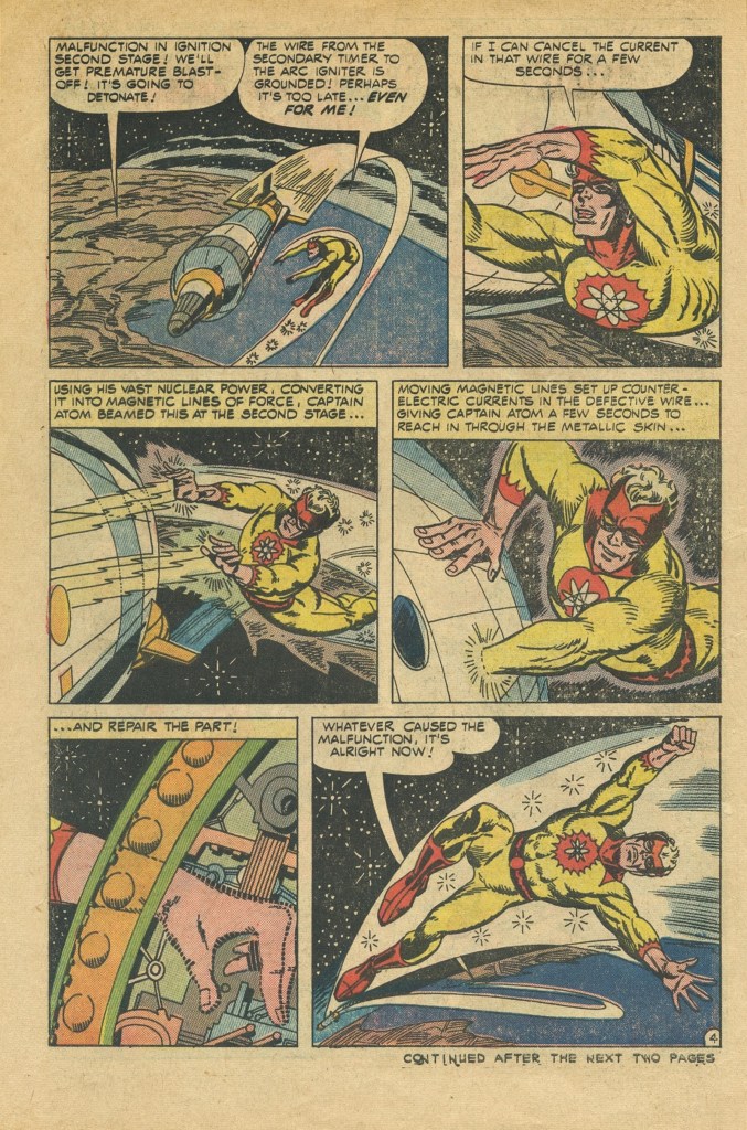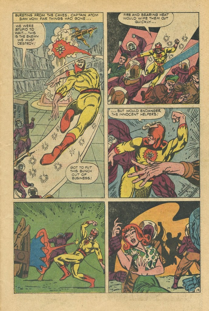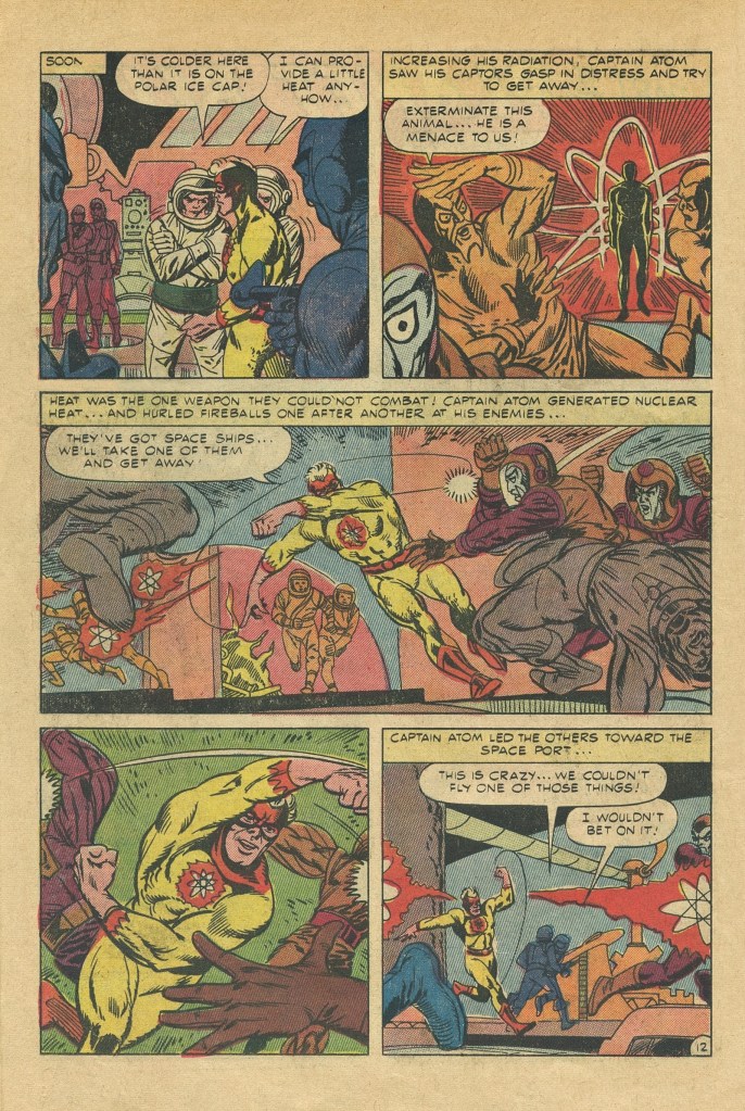 Truth be told, it’s a pretty dumb story, very much in keeping with the kinds of adventures the character had been showcased in during his initial run. Writer Joe Gill was able to make a living given Charlton’s notoriously stingy page rates (they were paying just $2.00 a page for script) by writing boatloads of material, often following the Robert Kanigher model of simply making things up as he typed. He wasn’t in touch with what Ditko, Lee, Jack Kirby and others had been doing over at Marvel in terms of characterization. So this first new Captain Atom story feels like a bit of a throwback, for all that the artwork is a bit more dynamic on Ditko’s part.