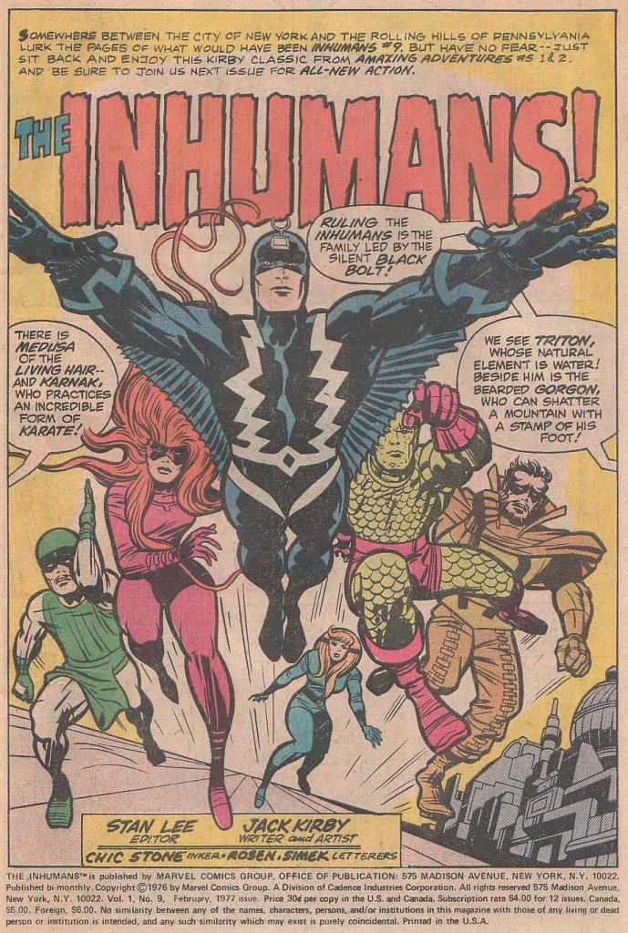 The story was reprinted from the first two issues of AMAZING ADVENTURES, the first time that the Inhumans had been granted a series of their own. These were done right at the end of Jack Kirby’s time at Marvel, and in an attempt to placate Kirby a little bit, editor Stan lee allowed the King to dialogue these two stories as well as plotting and penciling them. So they’re a good representation of what a Kirby-scripted Marvel story might have looked like. As a kid, none of the dialogue stood out in the way Kirby’s later 1970s prose sometimes could–it read to me much like any other Stan and Jack story. (In typical fashion, Lee’s credit came first, even though he was only the editor on this story. Lee was excellent and insightful when it comes to making sure that readers related the wonder of Marvel with him, regardless of who might have actually been producing the stories in question.) The one misstep to my young eyes was a place where Black Bolt was given thought balloons. The fact that the leader of the Inhumans was not only silent but you never got an inkling as to his inner workings was one of the aspects that made him alluring as a character, so this struck me as wrong.